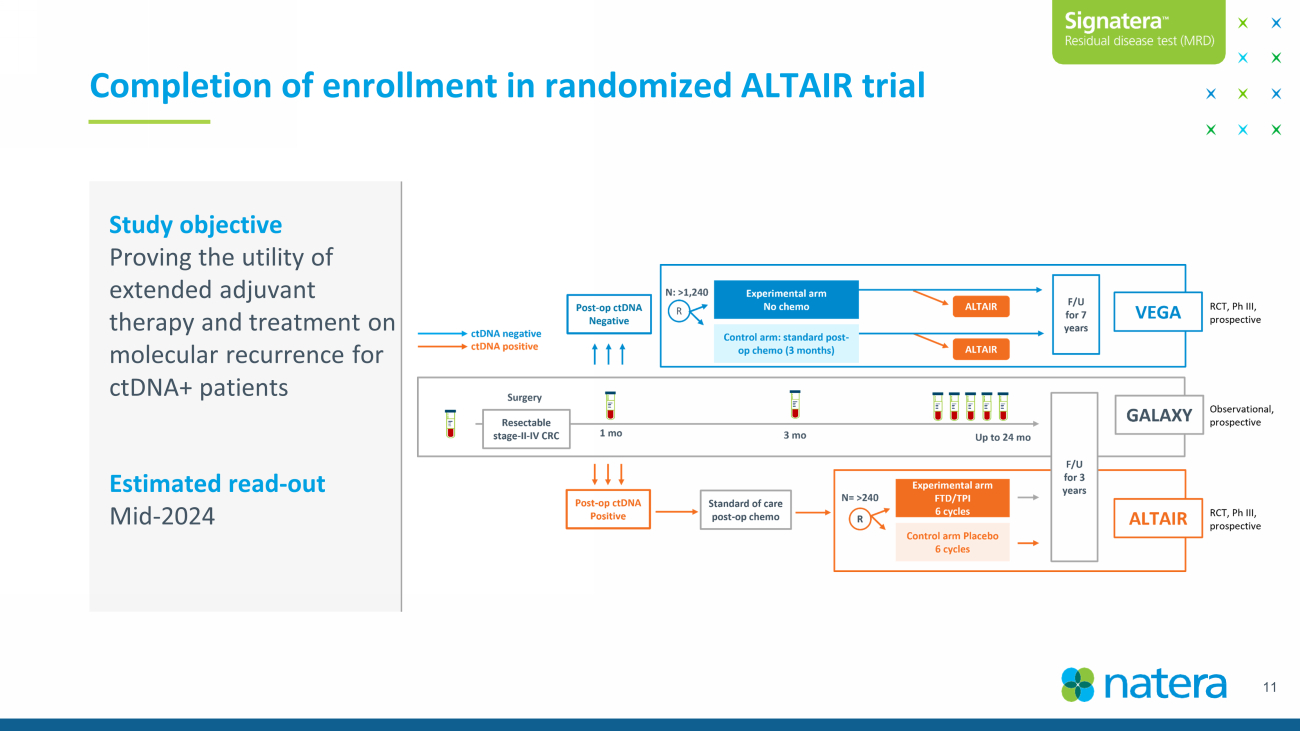 Not for reproduction or further distribution. INTERCEPT: clinical utility of routine surveillance in CRC Trial Background Surgery +/ – Neoadjuvant Therapy Adjuvant Therapy Surveillance • 184 patients were ctDNA+ during surveillance for disease recurrence. • 49% (90/184) of patients who were ctDNA+ during surveillance were found to have radiographically detectable disease, many of which required escalated imaging. • Of the patients who were ctDNA+ during surveillance and had no radiographic evidence of disease, 59% (55/94) were enrolled into clinical trials to treat on MRD. Highlights clinical utility of surveillance with Signatera in routine clinical practice. ASCO 2023 Poster 1 Discussion Results and Implications • MD Anderson’s independent program using Signatera testing in routine clinical care for stage II - III and resectable stage IV CRC patients. • 1,115 CRC patients (3,744 plasma time points) treated with curative intent were evaluated using Signatera over 14 months. 1. Dasari A et al. Positive ctDNA - based Minimal Residual Disease Assays During Surveillance Are Associated with High Rates of Undiagnosed Concomitant Radiographic Recurrences in Colorectal Cancer (CRC): Results from the MD Anderson INTERCEPT Program. ASCO, Chicago, IL. June 2 - 6, 2023. 10