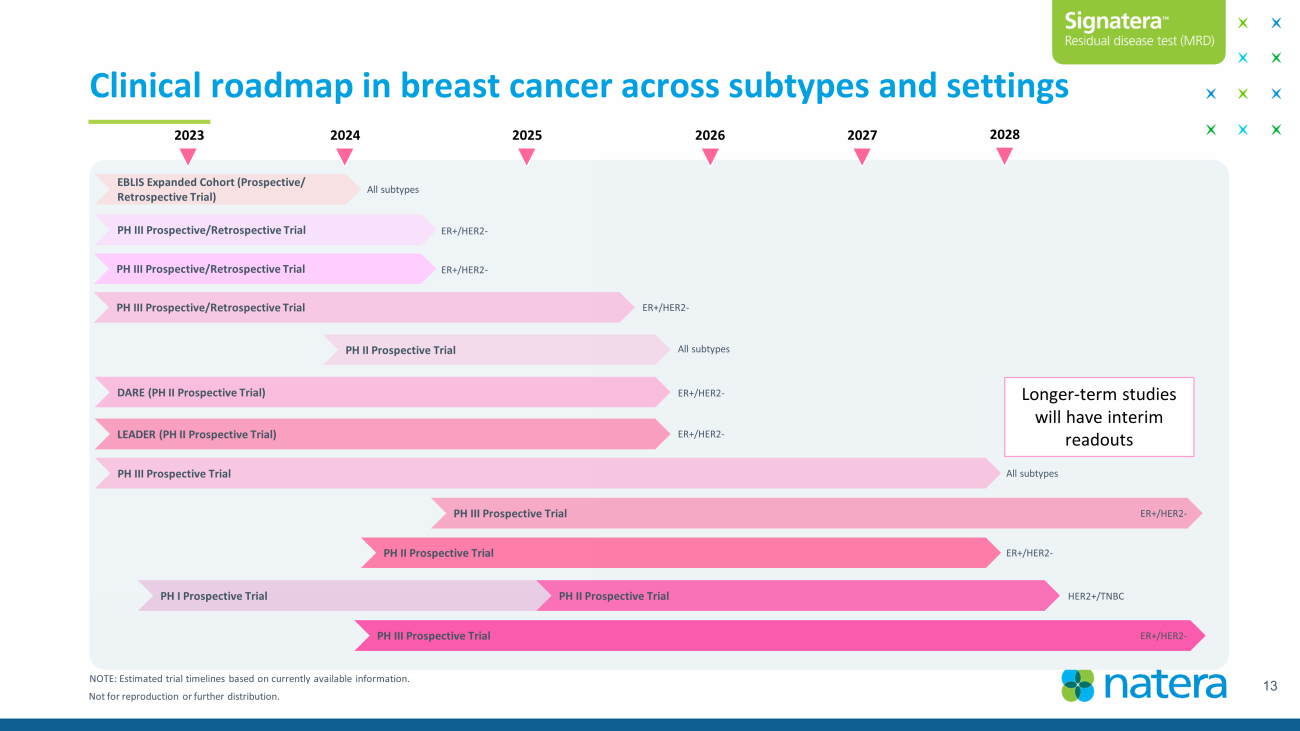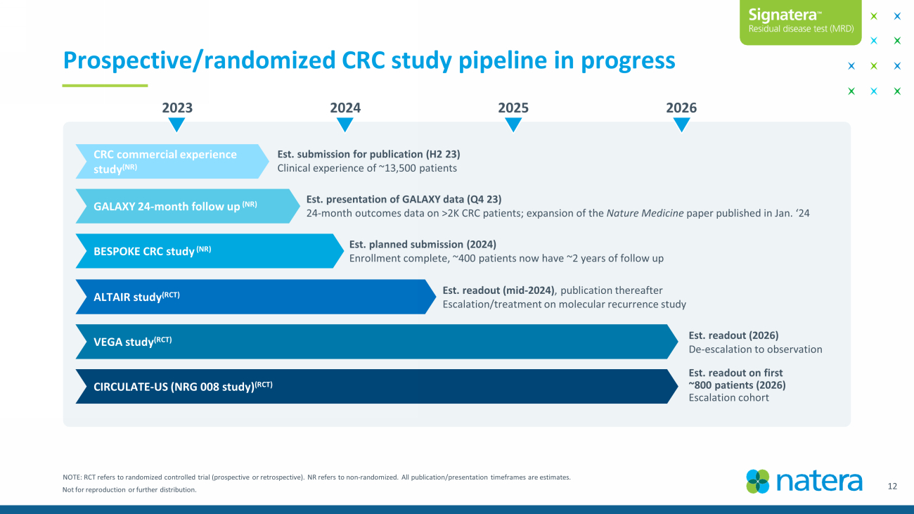 Not for reproduction or further distribution. Prospective/randomized CRC study pipeline in progress CRC commercial experience study (NR) Est. submission for publication (H2 23) Clinical experience of ~13,500 patients Est. presentation of GALAXY data (Q4 23) 24 - month outcomes data on >2K CRC patients; expansion of the Nature Medicine paper published in Jan. ‘24 Est. planned submission (2024) Enrollment complete, ~400 patients now have ~2 years of follow up Est. readout (mid - 2024) , publication thereafter Escalation/treatment on molecular recurrence study Est. readout (2026) De - escalation to observation Est. readout on first ~800 patients (2026) Escalation cohort BESPOKE CRC study (NR) ALTAIR study (RCT) VEGA study (RCT) CIRCULATE - US (NRG 008 study) (RCT) GALAXY 24 - month follow up (NR) 2024 2025 2026 2023 NOTE: RCT refers to randomized controlled trial (prospective or retrospective). NR refers to non - randomized. All publication/pre sentation timeframes are estimates. 12