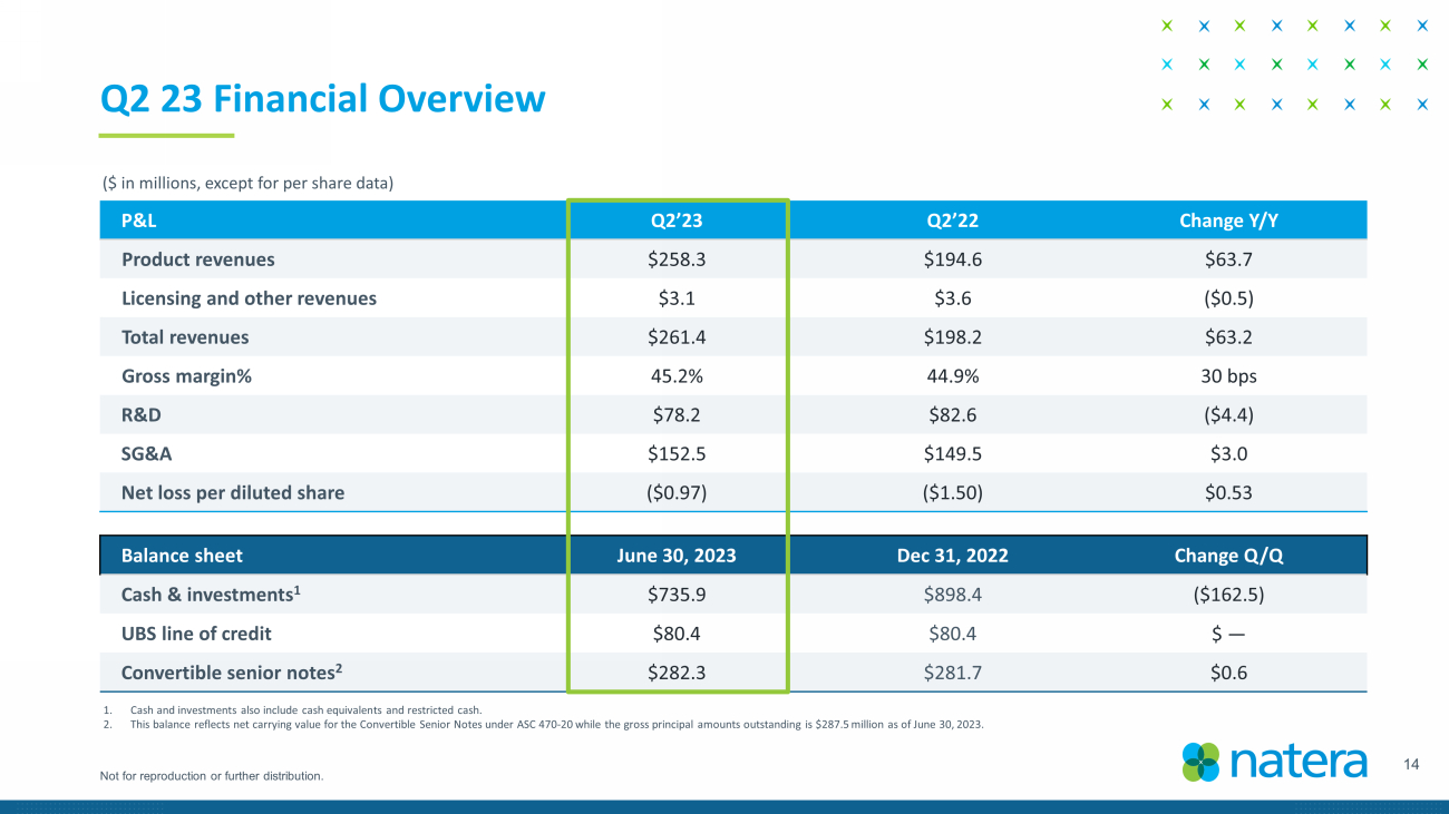 14 Not for reproduction or further distribution. Q2 23 Financial Overview ($ in millions, except for per share data) Balance sheet June 30, 2023 Dec 31, 2022 Change Q/Q Cash & investments 1 $735.9 $898.4 ($162.5) UBS line of credit $80.4 $80.4 $ — Convertible senior notes 2 $282.3 $281.7 $0.6 P&L Q2’23 Q2’22 Change Y/Y Product revenues $258.3 $194.6 $63.7 Licensing and other revenues $3.1 $3.6 ($0.5) Total revenues $261.4 $198.2 $63.2 Gross margin% 45.2% 44.9% 30 bps R&D $78.2 $82.6 ($4.4) SG&A $152.5 $149.5 $3.0 Net loss per diluted share ($0.97) ($1.50) $0.53 1. Cash and investments also include cash equivalents and restricted cash. 2. This balance reflects net carrying value for the Convertible Senior Notes under ASC 470 - 20 while the gross principal amounts out standing is $287.5 million as of June 30, 2023.