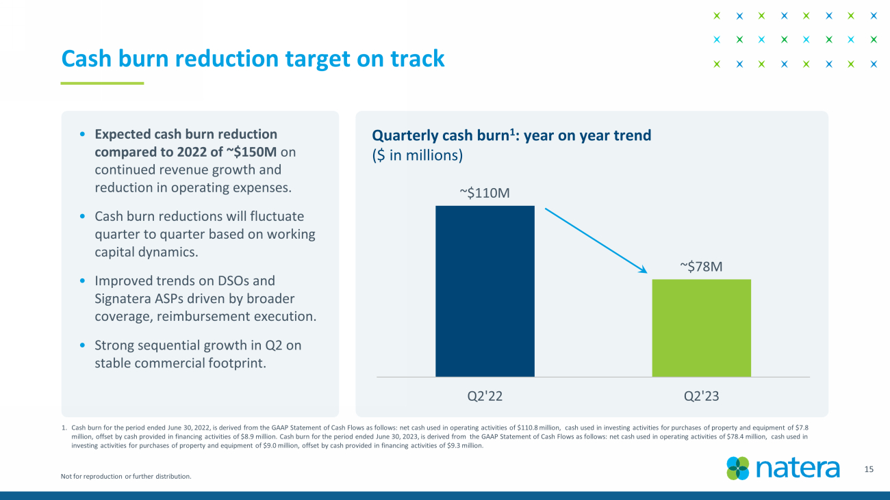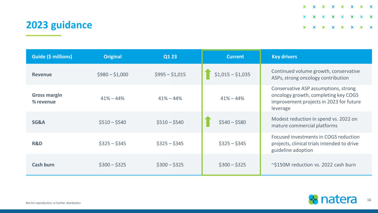 Not for reproduction or further distribution. Cash burn reduction target on track • Expected cash burn reduction compared to 2022 of ~$150M on continued revenue growth and reduction in operating expenses. • Cash burn reductions will fluctuate quarter to quarter based on working capital dynamics. • Improved trends on DSOs and Signatera ASPs driven by broader coverage, reimbursement execution. • Strong sequential growth in Q2 on stable commercial footprint. ~$110M ~$78M Q2'22 Q2'23 Quarterly cash burn 1 : year on year trend ($ in millions) 1. Cash burn for the period ended June 30, 2022, is derived from the GAAP Statement of Cash Flows as follows: net cash used in o per ating activities of $110.8 million, cash used in investing activities for purchases of property and equipment of $7.8 million, offset by cash provided in financing activities of $8.9 million. Cash burn for the period ended June 30, 2023, is derived from the GAAP Statement of Cash Flows as follows: net cash used in operating activities of $78.4 million, cash used in investing activities for purchases of property and equipment of $9.0 million, offset by cash provided in financing activities of $9.3 million. 15