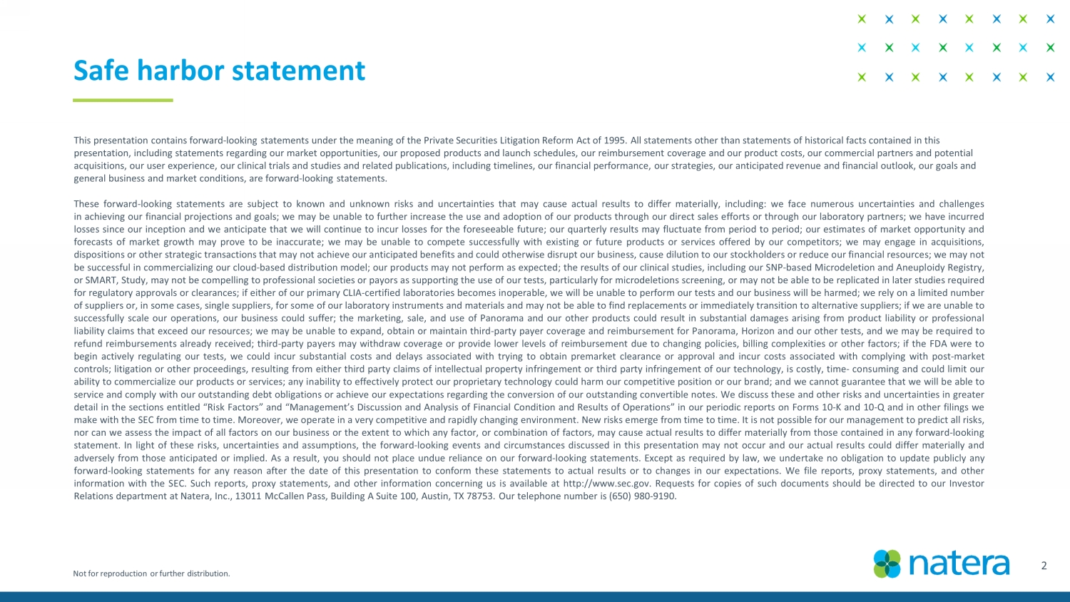 Not for reproduction or further distribution. This presentation contains forward - looking statements under the meaning of the Private Securities Litigation Reform Act of 1995. All statements other than statements of historical facts contained in this presentation, including statements regarding our market opportunities, our proposed products and launch schedules, our reimbu rse ment coverage and our product costs, our commercial partners and potential acquisitions, our user experience, our clinical trials and studies and related publications, including timelines, our financi al performance, our strategies, our anticipated revenue and financial outlook, our goals and general business and market conditions, are forward - looking statements. These forward - looking statements are subject to known and unknown risks and uncertainties that may cause actual results to differ materially, including : we face numerous uncertainties and challenges in achieving our financial projections and goals ; we may be unable to further increase the use and adoption of our products through our direct sales efforts or through our laboratory partners ; we have incurred losses since our inception and we anticipate that we will continue to incur losses for the foreseeable future ; our quarterly results may fluctuate from period to period ; our estimates of market opportunity and forecasts of market growth may prove to be inaccurate ; we may be unable to compete successfully with existing or future products or services offered by our competitors ; we may engage in acquisitions, dispositions or other strategic transactions that may not achieve our anticipated benefits and could otherwise disrupt our business, cause dilution to our stockholders or reduce our financial resources ; we may not be successful in commercializing our cloud - based distribution model ; our products may not perform as expected ; the results of our clinical studies, including our SNP - based Microdeletion and Aneuploidy Registry, or SMART, Study, may not be compelling to professional societies or payors as supporting the use of our tests, particularly for microdeletions screening, or may not be able to be replicated in later studies required for regulatory approvals or clearances ; if either of our primary CLIA - certified laboratories becomes inoperable, we will be unable to perform our tests and our business will be harmed ; we rely on a limited number of suppliers or, in some cases, single suppliers, for some of our laboratory instruments and materials and may not be able to find replacements or immediately transition to alternative suppliers ; if we are unable to successfully scale our operations, our business could suffer ; the marketing, sale, and use of Panorama and our other products could result in substantial damages arising from product liability or professional liability claims that exceed our resources ; we may be unable to expand, obtain or maintain third - party payer coverage and reimbursement for Panorama, Horizon and our other tests, and we may be required to refund reimbursements already received ; third - party payers may withdraw coverage or provide lower levels of reimbursement due to changing policies, billing complexities or other factors ; if the FDA were to begin actively regulating our tests, we could incur substantial costs and delays associated with trying to obtain premarket clearance or approval and incur costs associated with complying with post - market controls ; litigation or other proceedings, resulting from either third party claims of intellectual property infringement or third party infringement of our technology, is costly, time - consuming and could limit our ability to commercialize our products or services ; any inability to effectively protect our proprietary technology could harm our competitive position or our brand ; and we cannot guarantee that we will be able to service and comply with our outstanding debt obligations or achieve our expectations regarding the conversion of our outstanding convertible notes . We discuss these and other risks and uncertainties in greater detail in the sections entitled “Risk Factors” and “Management’s Discussion and Analysis of Financial Condition and Results of Operations” in our periodic reports on Forms 10 - K and 10 - Q and in other filings we make with the SEC from time to time . Moreover, we operate in a very competitive and rapidly changing environment . New risks emerge from time to time . It is not possible for our management to predict all risks, nor can we assess the impact of all factors on our business or the extent to which any factor, or combination of factors, may cause actual results to differ materially from those contained in any forward - looking statement . In light of these risks, uncertainties and assumptions, the forward - looking events and circumstances discussed in this presentation may not occur and our actual results could differ materially and adversely from those anticipated or implied . As a result, you should not place undue reliance on our forward - looking statements . Except as required by law, we undertake no obligation to update publicly any forward - looking statements for any reason after the date of this presentation to conform these statements to actual results or to changes in our expectations . We file reports, proxy statements, and other information with the SEC . Such reports, proxy statements, and other information concerning us is available at http : // www . sec . gov . Requests for copies of such documents should be directed to our Investor Relations department at Natera , Inc . , 13011 McCallen Pass, Building A Suite 100 , Austin, TX 78753 . Our telephone number is ( 650 ) 980 - 9190 . 2 Safe harbor statement Confidential Draft