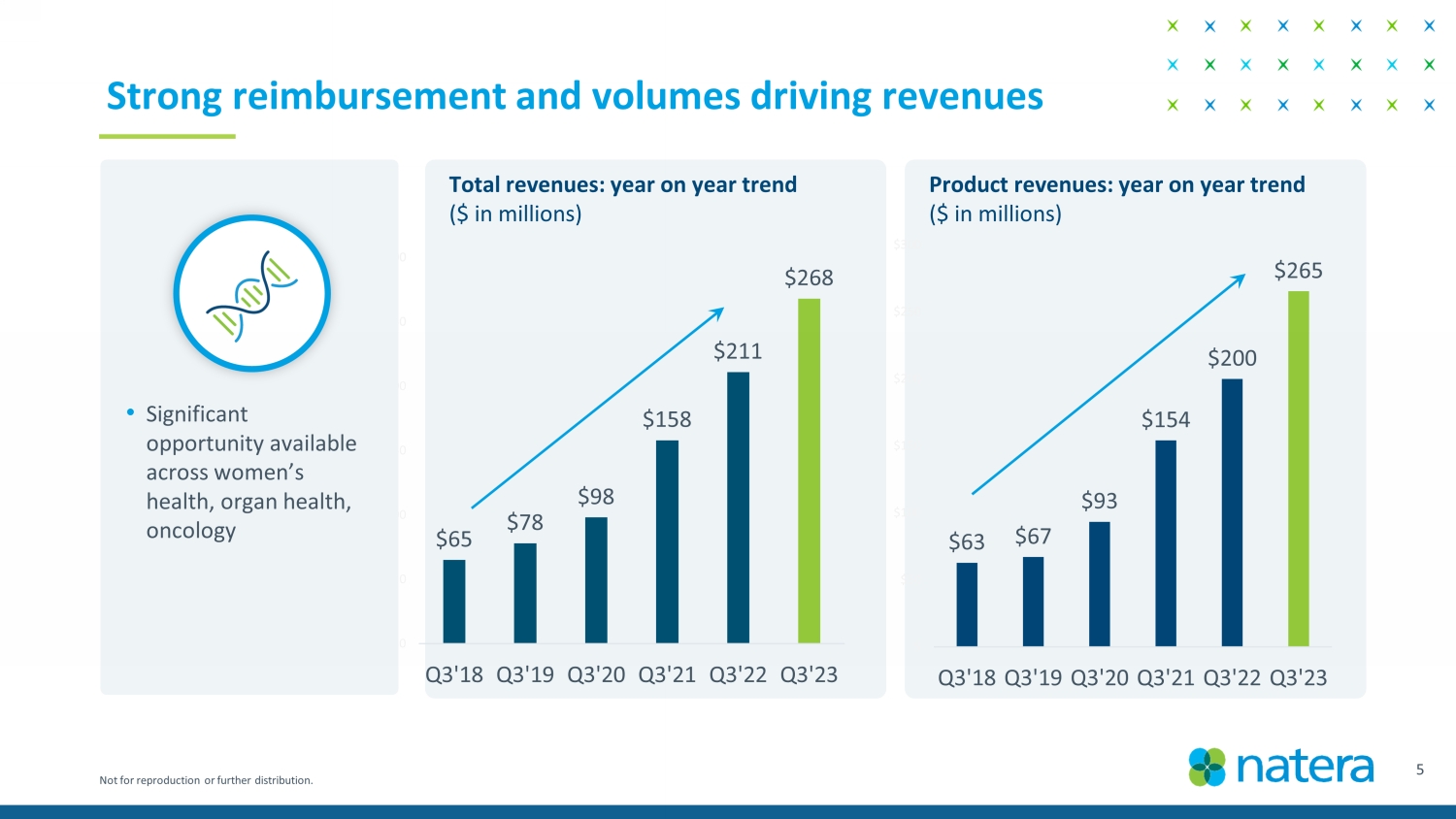 Not for reproduction or further distribution. 200K 262K 394K 503K 626K K 100K 200K 300K 400K 500K 600K 700K Q3'19 Q3'20 Q3'21 Q3'22 Q3'23 Quarterly processed volumes demonstrate continued momentum Core Volume Drivers • Serving large, underpenetrated markets • Differentiated technology backed by strong evidence • Growth in Signatera clinical as margin profile improves • Strong women’s health volume growth • Organ health tailwinds 407K 4 Confidential Draft 518K