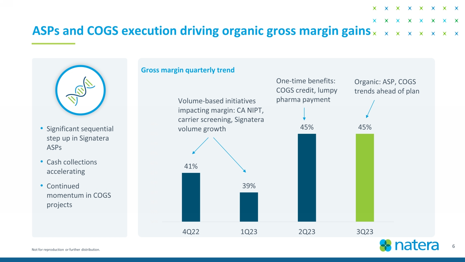 Not for reproduction or further distribution. Volume - based initiatives impacting margin: CA NIPT, carrier screening, Signatera volume growth One - time benefits: COGS credit, lumpy pharma payment ASPs and COGS execution driving organic gross margin gains • Significant sequential step up in Signatera ASPs • Cash collections accelerating • Con tinued momentum in COGS projects Gross margin quarterly trend 6 41% 39% 45% 45% 36% 37% 38% 39% 40% 41% 42% 43% 44% 45% 46% 4Q22 1Q23 2Q23 3Q23 Organic: ASP, COGS trends ahead of plan Confidential Draft
