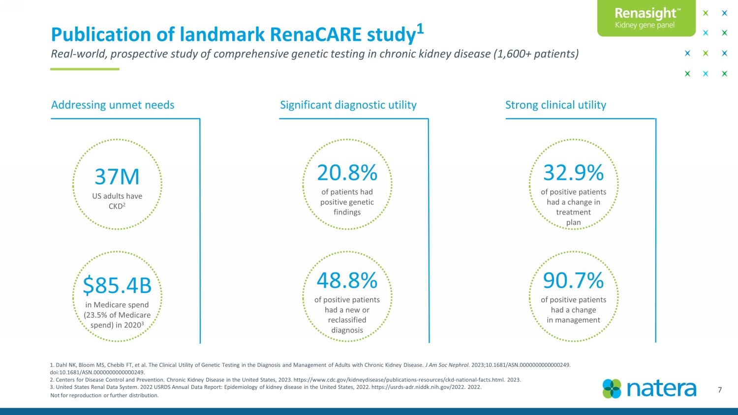 Not for reproduction or further distribution. 7 Publication of landmark RenaCARE study 1 Real - world, prospective study of comprehensive genetic testing in chronic kidney disease (1,600+ patients) 20.8% of patients had positive genetic findings 32.9% of positive patients had a change in treatment plan 37M US adults have CKD 2 Addressing unmet needs Significant diagnostic utility Strong clinical utility 48.8% of positive patients had a new or reclassified diagnosis 90.7% of positive patients had a change in management $85.4B in Medicare spend (23.5% of Medicare spend) in 2020 3 Confidential Draft 1. Dahl NK, Bloom MS, Chebib FT, et al. The Clinical Utility of Genetic Testing in the Diagnosis and Management of Adults with Chronic Kidney Disease. J Am Soc Nephrol . 2023;10.1681/ASN.0000000000000249. doi:10.1681/ASN.0000000000000249. 2. Centers for Disease Control and Prevention. Chronic Kidney Disease in the United States, 2023. https://www.cdc.gov/kidneyd ise ase/publications - resources/ckd - national - facts.html. 2023. 3. United States Renal Data System. 2022 USRDS Annual Data Report: Epidemiology of kidney disease in the United States, 2022. ht tps://usrds - adr.niddk.nih.gov/2022. 2022.