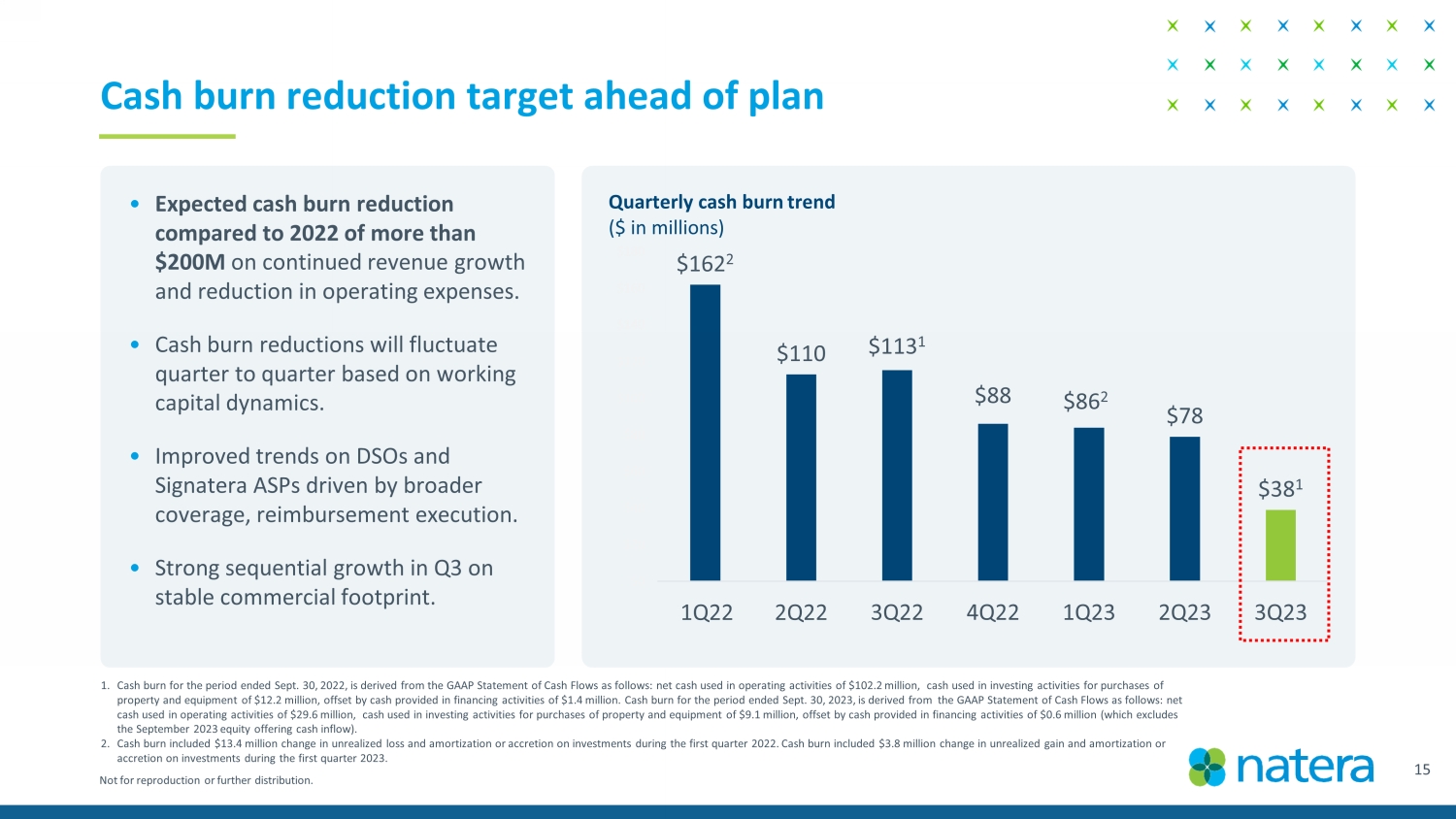 Not for reproduction or further distribution. $162 2 $110 $113 1 $88 $86 2 $78 $38 1 $0 $20 $40 $60 $80 $100 $120 $140 $160 $180 1Q23 2Q23 3Q22 4Q22 1Q23 2Q23 3Q23 Cash burn reduction target ahead of plan • Expected cash burn reduction compared to 2022 of more than $200M on continued revenue growth and reduction in operating expenses. • Cash burn reductions will fluctuate quarter to quarter based on working capital dynamics. • Improved trends on DSOs and Signatera ASPs driven by broader coverage, reimbursement execution. • Strong sequential growth in Q3 on stable commercial footprint. Quarterly cash burn trend ($ in millions) 1. Cash burn for the period ended Sept. 30, 2022, is derived from the GAAP Statement of Cash Flows as follows: net cash used in ope rating activities of $102.2 million, cash used in investing activities for purchases of property and equipment of $12.2 million, offset by cash provided in financing activities of $1.4 million. Cash burn for the p eri od ended Sept. 30, 2023, is derived from the GAAP Statement of Cash Flows as follows: net cash used in operating activities of $29.6 million, cash used in investing activities for purchases of property and equipmen t o f $9.1 million, offset by cash provided in financing activities of $0.6 million (which excludes the September 2023 equity offering cash inflow). 2. Cash burn included $13.4 million change in unrealized loss and amortization or accretion on investments during the first quar ter 2022. Cash burn included $3.8 million change in unrealized gain and amortization or accretion on investments during the first quarter 2023. 16 Confidential Draft 1Q22 2Q22