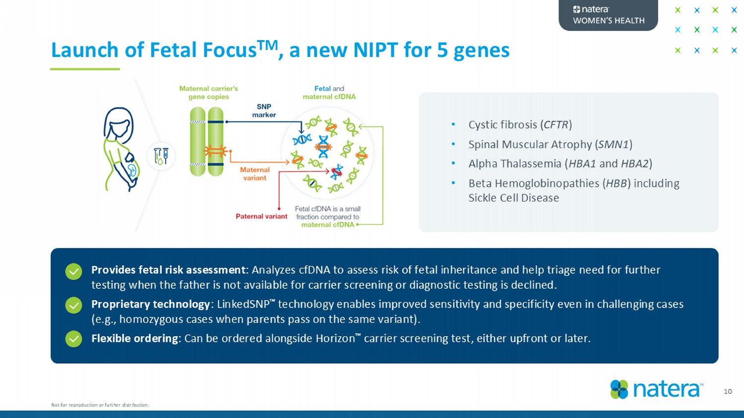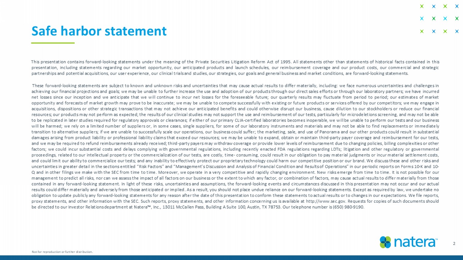 This presentation contains forward - looking statements under the meaning of the Private Securities Litigation Reform Act of 1995 . All statements other than statements of historical facts contained in this presentation, including statements regarding our market opportunity, our anticipated products and launch schedules, our reimbursement coverage and our product costs, our commercial and strategic partnerships and potential acquisitions, our user experience, our clinical trials and studies, our strategies, our goals and general business and market conditions, are forward - looking statements . These forward - looking statements are subject to known and unknown risks and uncertainties that may cause actual results to differ materially, including : we face numerous uncertainties and challenges in achieving our financial projections and goals ; we may be unable to further increase the use and adoption of our products through our direct sales efforts or through our laboratory partners ; we have incurred net losses since our inception and we anticipate that we will continue to incur net losses for the foreseeable future ; our quarterly results may fluctuate from period to period ; our estimates of market opportunity and forecasts of market growth may prove to be inaccurate ; we may be unable to compete successfully with existing or future products or services offered by our competitors ; we may engage in acquisitions, dispositions or other strategic transactions that may not achieve our anticipated benefits and could otherwise disrupt our business, cause dilution to our stockholders or reduce our financial resources ; our products may not perform as expected ; the results of our clinical studies may not support the use and reimbursement of our tests, particularly for microdeletions screening, and may not be able to be replicated in later studies required for regulatory approvals or clearances ; if either of our primary CLIA - certified laboratories becomes inoperable, we will be unable to perform our tests and our business will be harmed ; we rely on a limited number of suppliers or, in some cases, single suppliers, for some of our laboratory instruments and materials and may not be able to find replacements or immediately transition to alternative suppliers ; if we are unable to successfully scale our operations, our business could suffer ; the marketing, sale, and use of Panorama and our other products could result in substantial damages arising from product liability or professional liability claims that exceed our resources ; we may be unable to expand, obtain or maintain third - party payer coverage and reimbursement for our tests, and we may be required to refund reimbursements already received ; third - party payers may withdraw coverage or provide lower levels of reimbursement due to changing policies, billing complexities or other factors ; we could incur substantial costs and delays complying with governmental regulations, including recently enacted FDA regulations regarding LDTs ; litigation and other regulatory or governmental proceedings, related to our intellectual property or the commercialization of our tests, are costly, time - consuming, could result in our obligation to pay material judgments or incur material settlement costs, and could limit our ability to commercialize our tests ; and any inability to effectively protect our proprietary technology could harm our competitive position or our brand . We discuss these and other risks and uncertainties in greater detail in the sections entitled “Risk Factors” and “Management’s Discussion and Analysis of Financial Condition and Results of Operations” in our periodic reports on Forms 10 - K and 10 - Q and in other filings we make with the SEC from time to time . Moreover, we operate in a very competitive and rapidly changing environment . New risks emerge from time to time . It is not possible for our management to predict all risks, nor can we assess the impact of all factors on our business or the extent to which any factor, or combination of factors, may cause actual results to differ materially from those contained in any forward - looking statement . In light of these risks, uncertainties and assumptions, the forward - looking events and circumstances discussed in this presentation may not occur and our actual results could differ materially and adversely from those anticipated or implied . As a result, you should not place undue reliance on our forward - looking statements . Except as required by law, we undertake no obligation to update publicly any forward - looking statements for any reason after the date of this presentation to conform these statements to actual results or to changes in our expectations . We file reports, proxy statements, and other information with the SEC . Such reports, proxy statements, and other information concerning us is available at http : //www . sec . gov . Requests for copies of such documents should be directed to our Investor Relations department at Natera , Inc . , 13011 McCallen Pass, Building A Suite 100 , Austin, TX 78753 . Our telephone number is ( 650 ) 980 - 9190 . 2 Safe harbor statement Not for reproduction or further distribution.