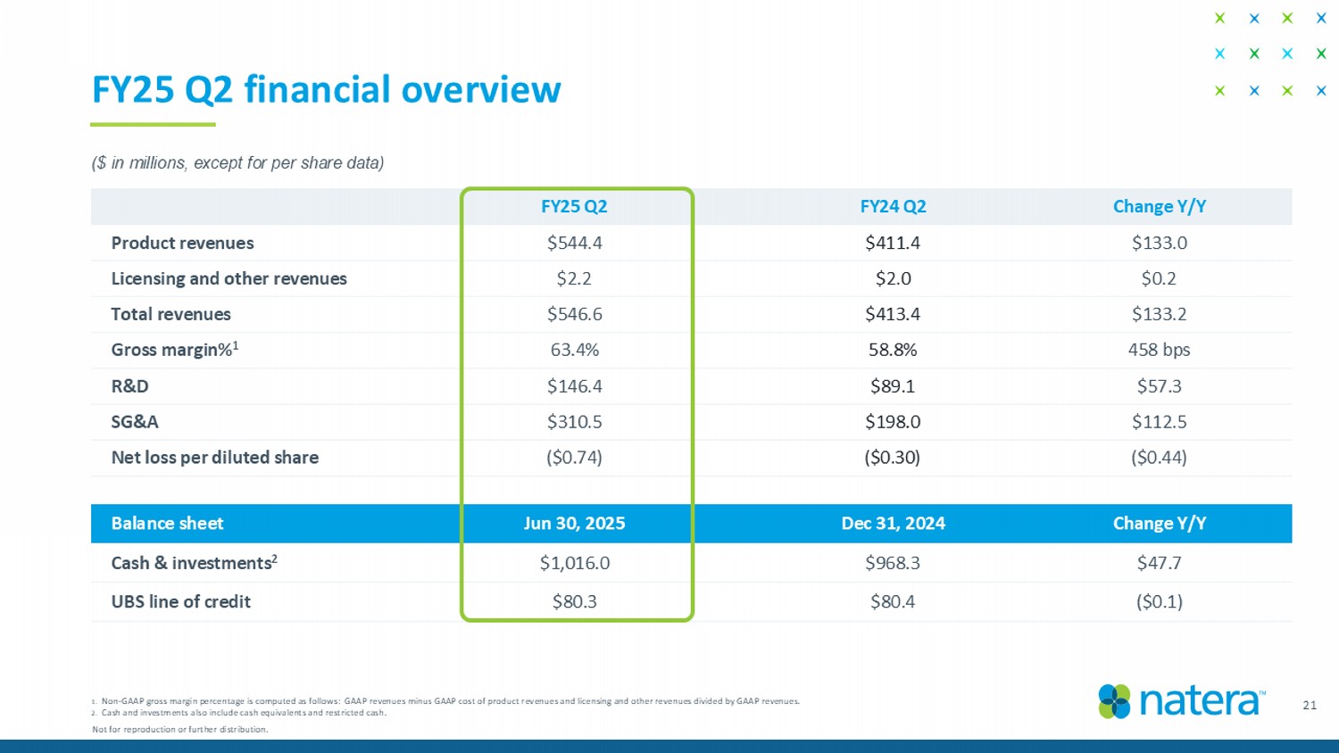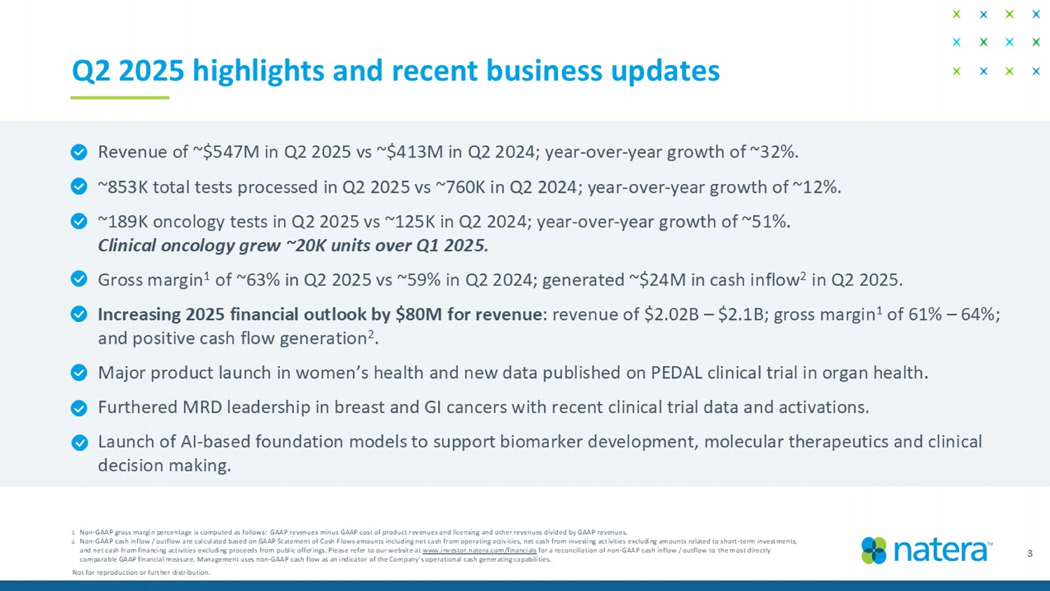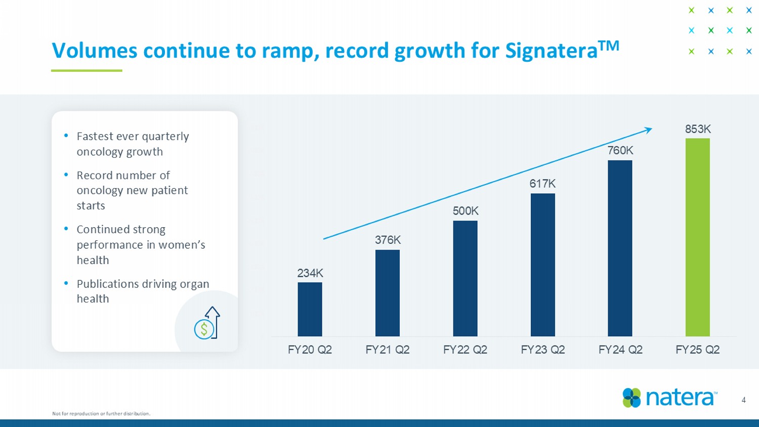 3 Q2 2025 highlights and recent business updates Not for reproduction or further distribution. 1. Non - GAAP gross margin percentage is computed as follows: GAAP revenues minus GAAP cost of product revenues and licensing and ot her revenues divided by GAAP revenues. 2. Non - GAAP cash inflow / outflow are calculated based on GAAP Statement of Cash Flows amounts including net cash from operating ac tivities, net cash from investing activities excluding amounts related to short - term investments, and net cash from financing activities excluding proceeds from public offerings. Please refer to our website at www.investor.natera.com/financials for a reconciliation of non - GAAP cash inflow / outflow to the most directly comparable GAAP financial measure. Management uses non - GAAP cash flow as an indicator of the Company’s operational cash generati ng capabilities. Revenue of ~$547M in Q2 2025 vs ~$413M in Q2 2024; year - over - year growth of ~32%. ~853K total tests processed in Q2 2025 vs ~760K in Q2 2024; year - over - year growth of ~12%. ~189K oncology tests in Q2 2025 vs ~125K in Q2 2024; year - over - year growth of ~51%. Clinical oncology grew ~20K units over Q1 2025. Gross margin 1 of ~63% in Q2 2025 vs ~59% in Q2 2024; generated ~$24M in cash inflow 2 in Q2 2025. Increasing 2025 financial outlook by $80M for revenue : revenue of $2.02B – $2.1B; gross margin 1 of 61% – 64%; and positive cash flow generation 2 . Major product launch in women’s health and new data published on PEDAL clinical trial in organ health. Furthered MRD leadership in breast and GI cancers with recent clinical trial data and activations. Launch of AI - based foundation models to support biomarker development, molecular therapeutics and clinical decision making.