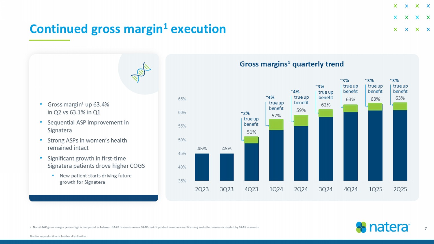 $86M $142M $198M $261M $413M $547M $M $100M $200M $300M $400M $500M $600M FY20 Q2 FY21 Q2 FY22 Q2 FY23 Q2 FY24 Q2 FY25 Q2 Revenues continue to ramp: ~32% revenue growth over Q2’24 32% 6 • ~34% 1 annual growth ex - true ups • ~9% sequential growth over record Q1’25 despite seasonal dip in women’s health volumes • Strong new account wins in all business units • Record Signatera growth • Continued gains in ASPs Not for reproduction or further distribution. 1. 34% annual growth ex true - ups is a non - GAAP percentage which takes FY25 Q2 total GAAP revenues of $547M less non - GAAP revenue co llection true ups of $45M over the FY24 Q2 total GAAP revenues of $413M less non - GAAP revenue collection true ups of $40M.