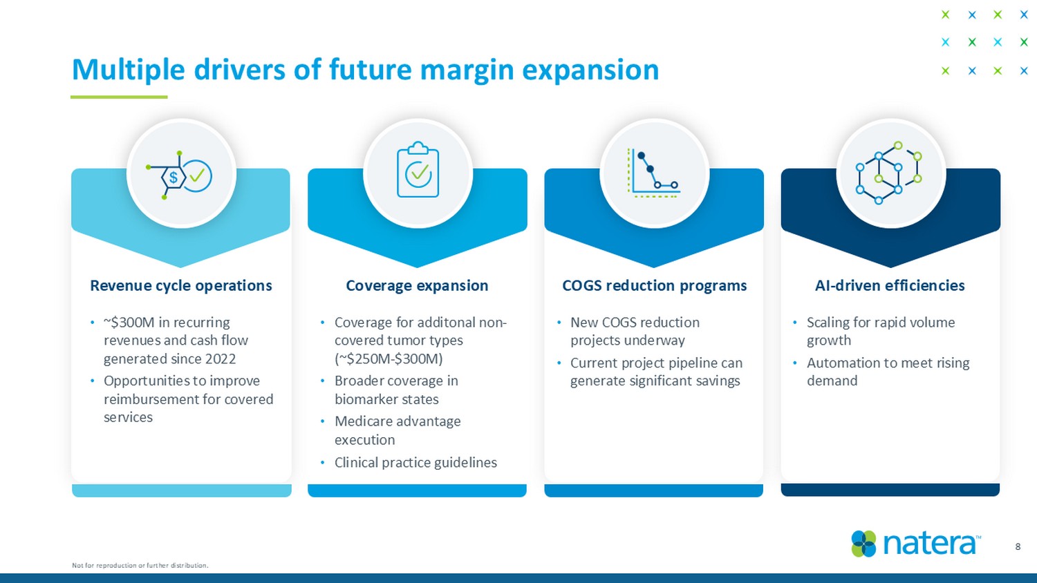 7 Continued gross margin 1 execution Gross margins 1 quarterly trend • Gross margin 1 up 63.4% in Q2 vs 63.1% in Q1 • Sequential ASP improvement in Signatera • Strong ASPs in women’s health remained intact • Significant growth in first - time Signatera patients drove higher COGS • New patient starts driving future growth for Signatera 45% 45% 51% 57% 59% 62% 63% 63% 63% 35% 40% 45% 50% 55% 60% 65% 2Q23 3Q23 4Q23 1Q24 2Q24 3Q24 4Q24 1Q25 2Q25 ~ 2 % true up benefit ~4% true up benefit ~4% true up benefit ~3% true up benefit ~3% true up benefit ~3% true up benefit ~3% true up benefit Not for reproduction or further distribution. 1. Non - GAAP gross margin percentage is computed as follows: GAAP revenues minus GAAP cost of product revenues and licensing and ot her revenues divided by GAAP revenues.
