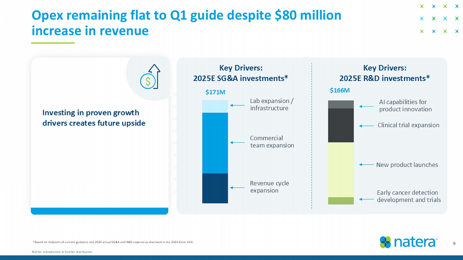 8 Multiple drivers of future margin expansion • Scaling for rapid volume growth • Automation to meet rising demand • New COGS reduction projects underway • Current project pipeline can generate significant savings Revenue cycle operations Coverage expansion COGS reduction programs AI - driven efficiencies • ~$300M in recurring revenues and cash flow 1 generated since 2022 • Opportunities to improve reimbursement for covered services • Coverage for additonal non - covered tumor types (~$250M - $300M) • Broader coverage in biomarker states • Medicare advantage execution • Clinical practice guidelines Not for reproduction or further distribution. 1. Non - GAAP cash inflow / outflow are calculated based on GAAP Statement of Cash Flows amounts including net cash from operating ac tivities, net cash from investing activities excluding amounts related to short - term investments, and net cash from financing activities excluding proceeds from public offerings. Please refer to our website at www.investor.natera.com/financials for a reconciliation of non - GAAP cash inflow / outflow to the most directly comparable GAAP financial measure. Management uses non - GAAP cash flow as an indicator of the Company’s operational cash generati ng capabilities.