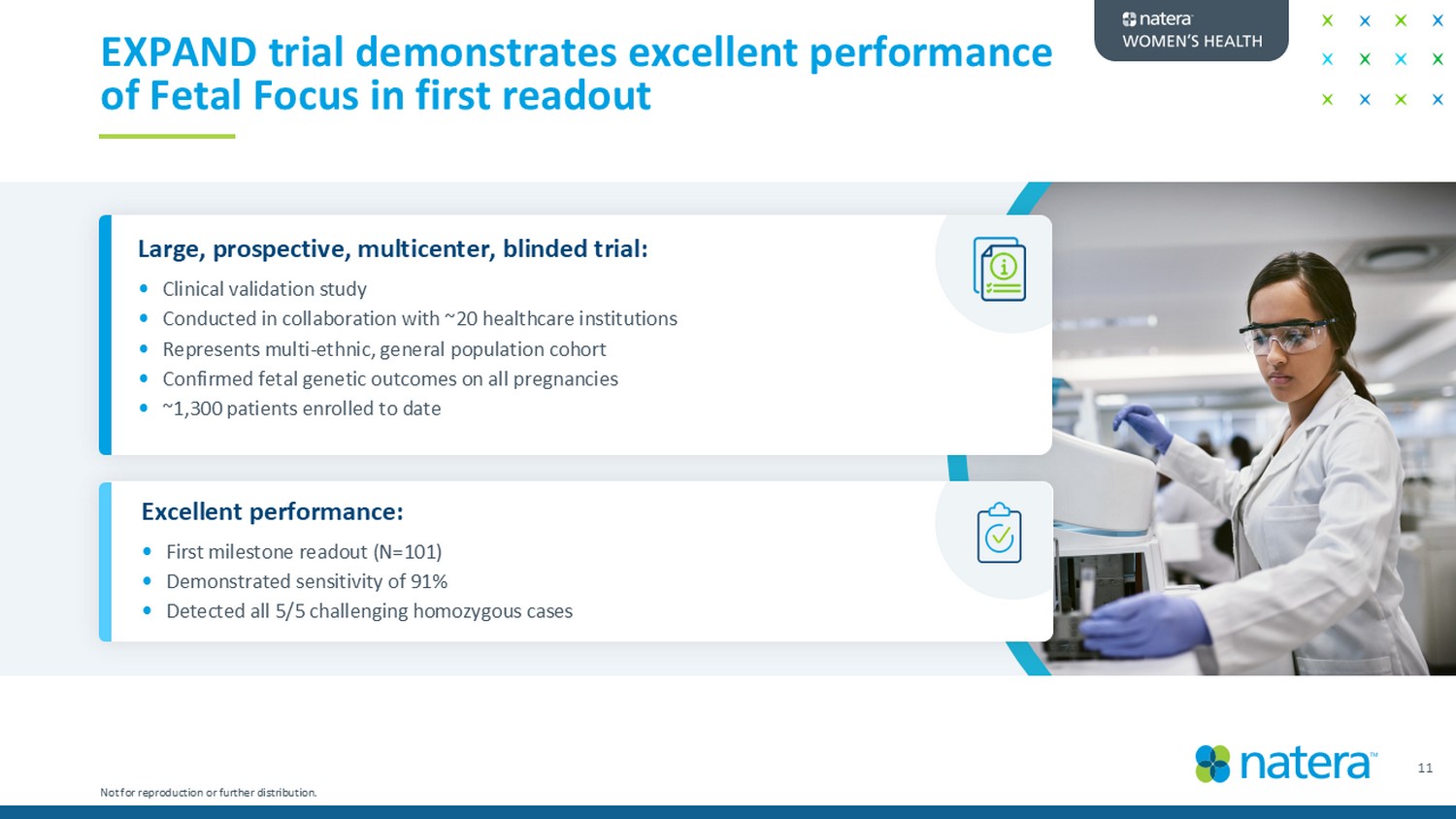 EXPAND trial demonstrates excellent performance of Fetal Focus in first readout Not for reproduction or further distribution. Large, prospective, multicenter, blinded trial: • Clinical validation study • Conducted in collaboration with ~20 healthcare institutions • Represents multi - ethnic, general population cohort • Confirmed fetal genetic outcomes on all pregnancies • ~1,300 patients enrolled to date Excellent performance: • First milestone readout (N=101) • Demonstrated sensitivity of 91% • Detected all 5/5 challenging homozygous cases Confidential draft – not for distribution outside of Natera 11
