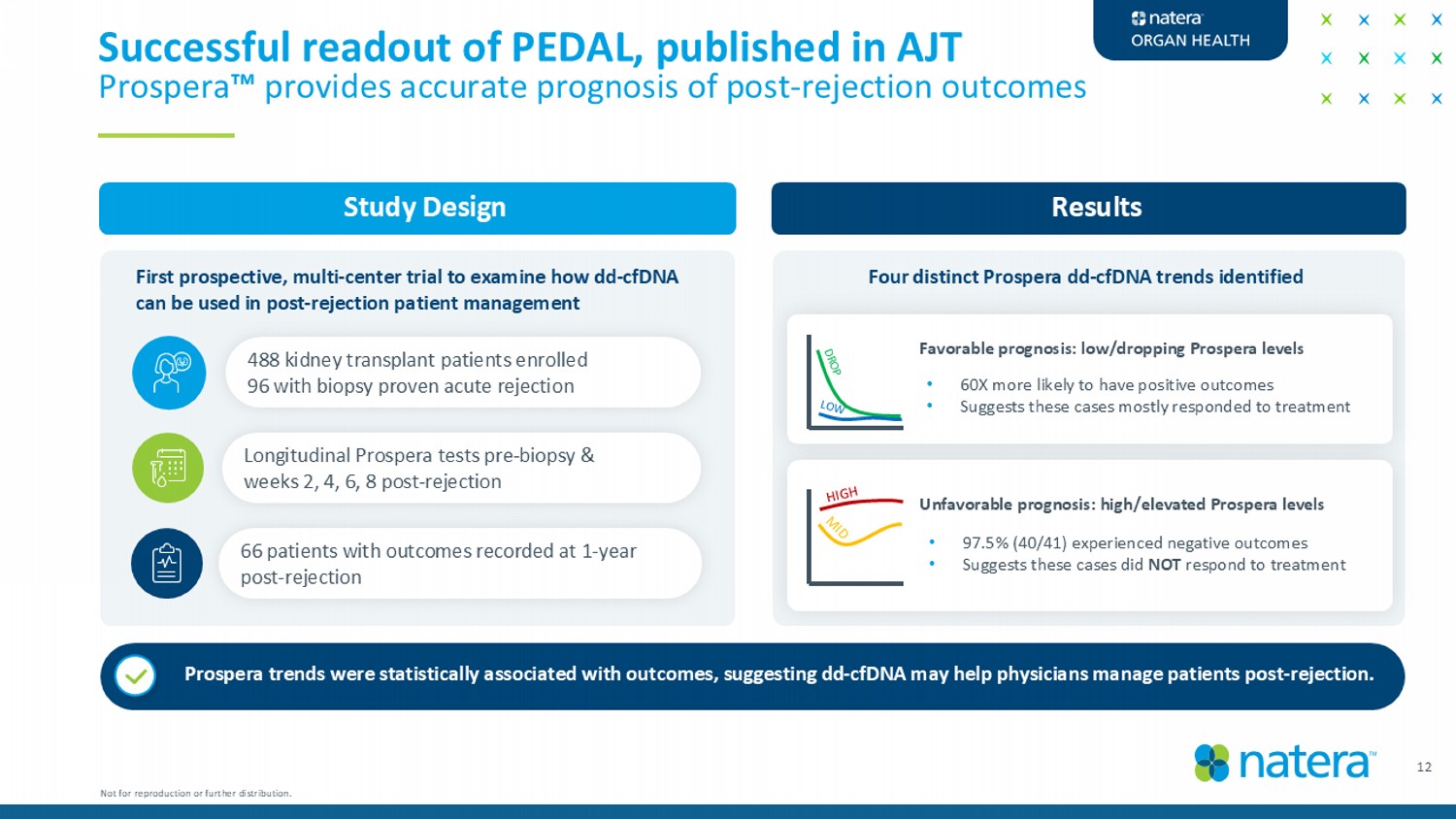 Successful readout of PEDAL, published in AJT Prospera provides accurate prognosis of post - rejection outcomes 488 kidney transplant patients enrolled 96 with biopsy proven acute rejection Objecti ve Longitudinal Prospera tests pre - biopsy & weeks 2, 4, 6, 8 post - rejection 66 patients with outcomes recorded at 1 - year post - rejection • 60X more likely to have positive outcomes • Suggests these cases mostly responded to treatment Study Design Results Four distinct Prospera dd - cfDNA trends identified Favorable prognosis: low/dropping Prospera levels • 97.5% (40/41) experienced negative outcomes • Suggests these cases did NOT respond to treatment Unfavorable prognosis: high/elevated Prospera levels First prospective, multi - center trial to examine how dd - cfDNA can be used in post - rejection patient management Prospera trends were statistically associated with outcomes, suggesting dd - cfDNA may help physicians manage patients post - rejection. Not for reproduction or further distribution. 12