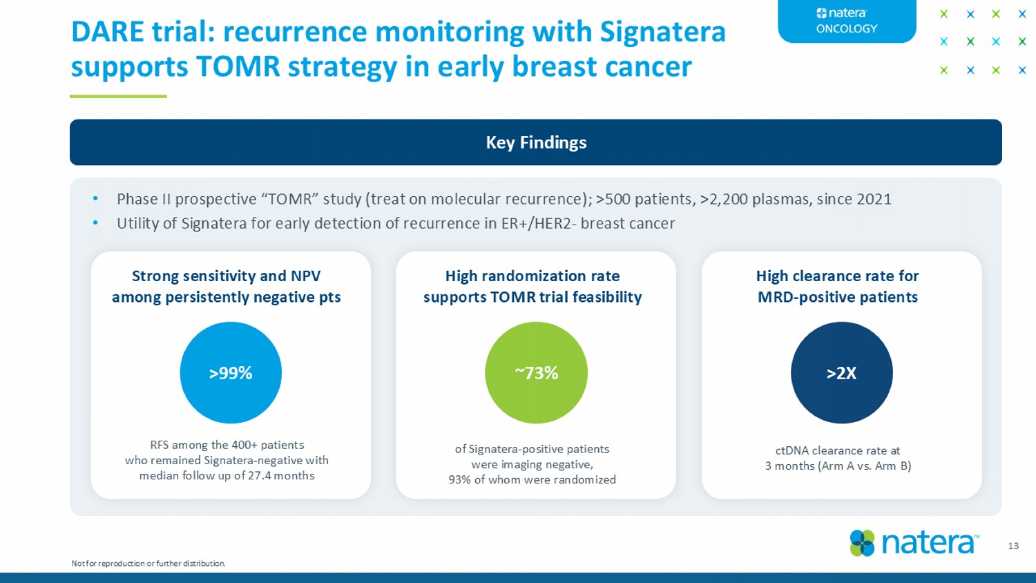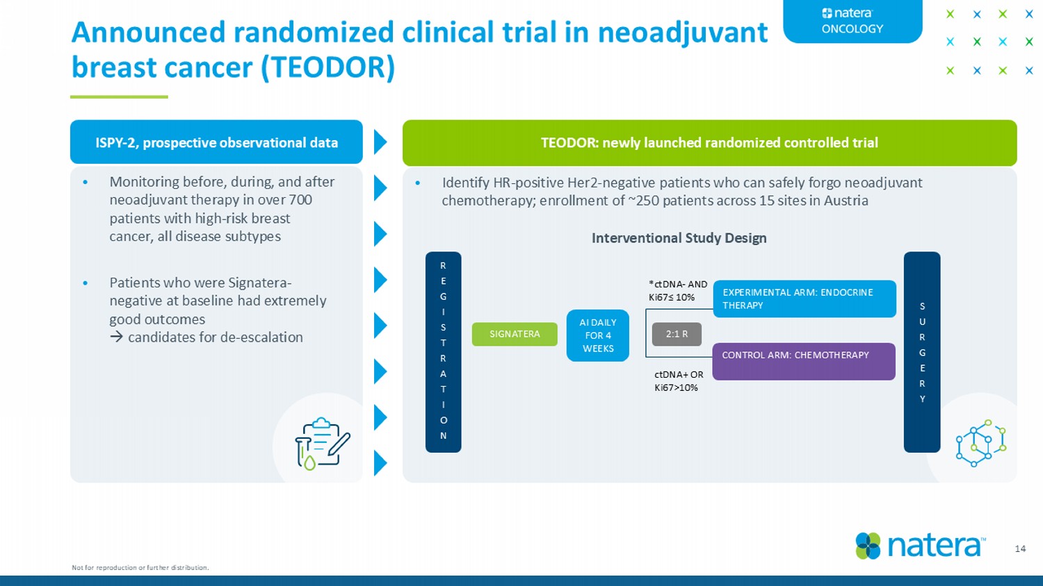 Key Findings DARE trial: recurrence monitoring with Signatera supports TOMR strategy in early breast cancer • Phase II prospective “TOMR” study ( treat on molecular recurrence ); >500 patients, >2,200 plasmas, since 2021 • Utility of Signatera for early detection of recurrence in ER+/HER2 - breast cancer >99% >2X ~73% RFS among the 400+ patients who remained Signatera - negative with median follow up of 27.4 months ctDNA clearance rate at 3 months (Arm A vs. Arm B) of Signatera - positive patients were imaging negative, 93% of whom were randomized High clearance rate for MRD - positive patients Strong sensitivity and NPV among persistently negative pts High randomization rate supports TOMR trial feasibility Not for reproduction or further distribution. 13