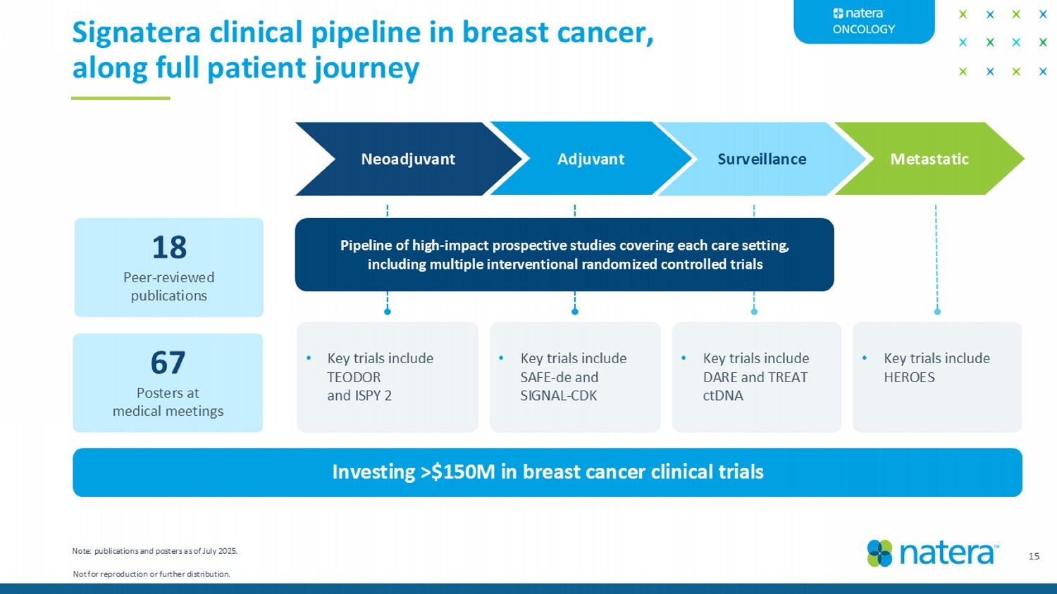 14 Announced randomized clinical trial in neoadjuvant breast cancer (TEODOR) ISPY - 2, prospective observational data TEODOR: newly launched randomized controlled trial • Monitoring before, during, and after neoadjuvant therapy in over 700 patients with high - risk breast cancer, all disease subtypes • Patients who were Signatera - negative at baseline had extremely good outcomes candidates for de - escalation • Identify HR - positive Her2 - negative patients who can safely forgo neoadjuvant chemotherapy; enrollment of ~250 patients across 15 sites in Austria R E G I S T R A T I O N S U R G E R Y AI DAILY FOR 4 WEEKS *ctDNA - AND Ki67≤ 10% ctDNA+ OR Ki67>10% 2:1 R EXPERIMENTAL ARM : ENDOCRINE THERAPY CONTROL ARM : CHEMOTHERAPY Not for reproduction or further distribution. Interventional Study Design SIGNATERA