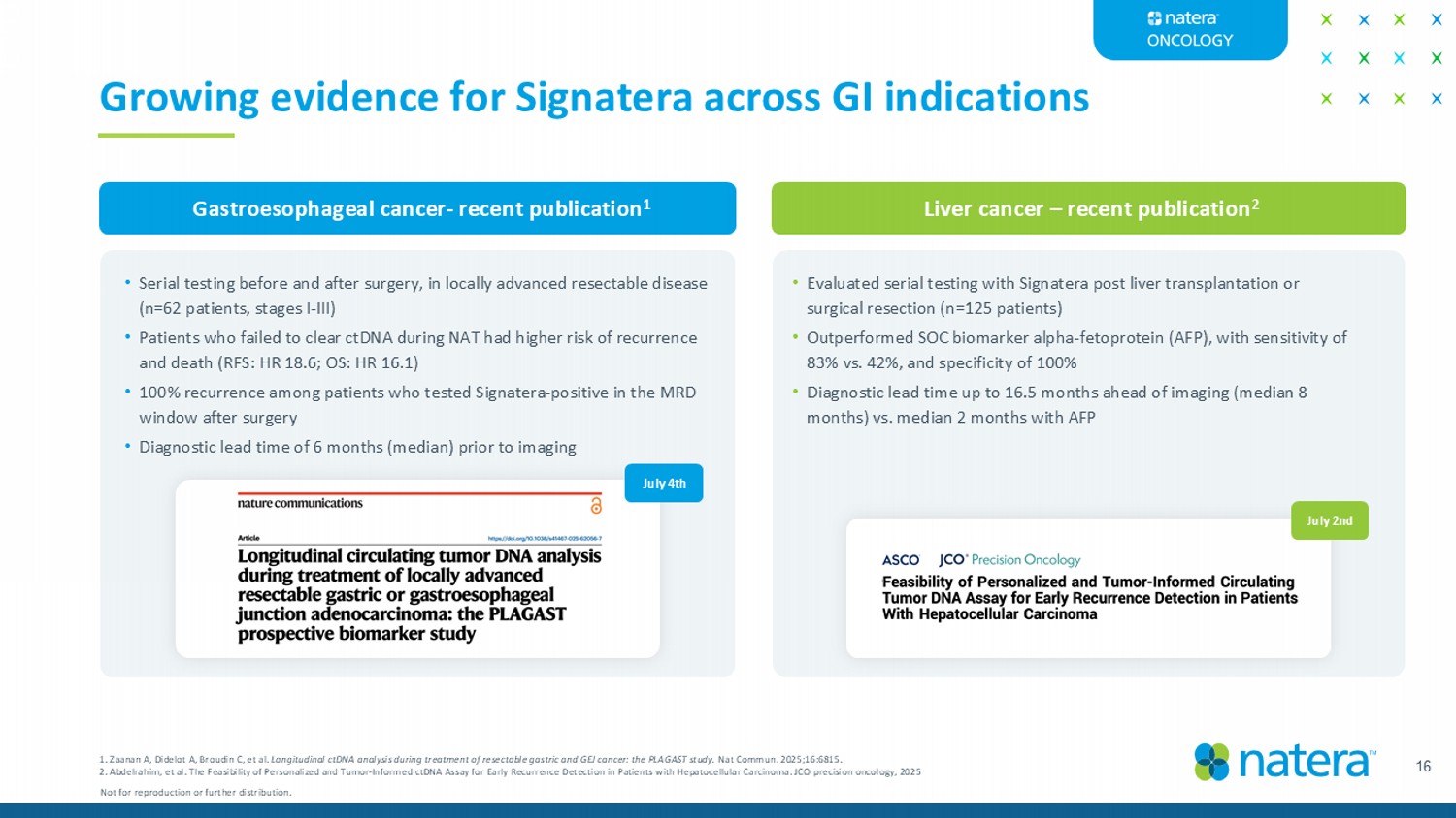 15 Note: publications and posters as of July 2025. Signatera clinical pipeline in breast cancer, along full patient journey 18 Peer - reviewed publications 67 Posters at medical meetings Neoadjuvant Adjuvant Surveillance • Key trials include SAFE - de and SIGNAL - CDK • Key trials include DARE and TREAT ctDNA Metastatic Pipeline of high - impact prospective studies covering each care setting, including multiple interventional randomized controlled trials Not for reproduction or further distribution. Investing >$150M in breast cancer clinical trials • Key trials include TEODOR and ISPY 2 • Key trials include HEROES