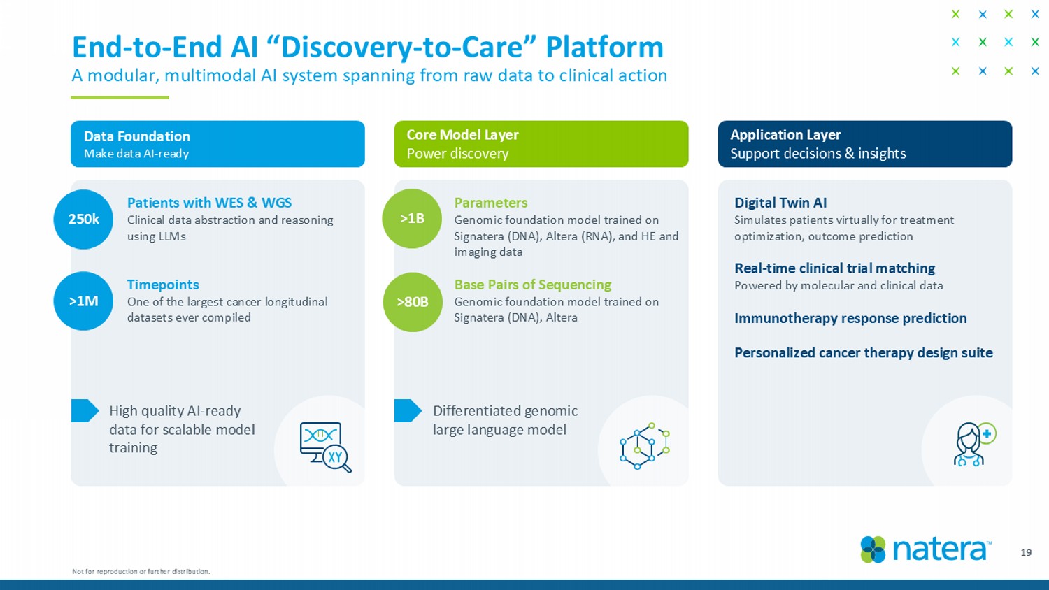 18 Deploying AI across the Company Not for reproduction or further distribution. Efficiency Automate to meet rising demand Targeting ~$200M in value User Experience Innovative tools to improve patient and provider experience Clinical and Data Biomarker development, molecular therapeutics and clinical decision - making tools