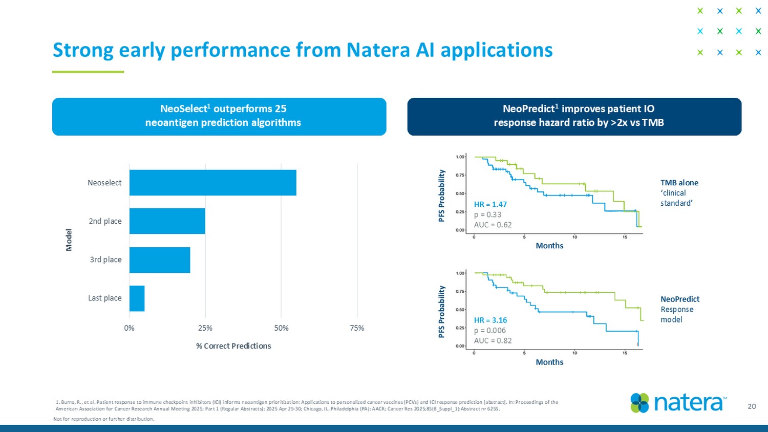 20 1. Burns, R., et al. Patient response to immune checkpoint inhibitors (ICI) informs neoantigen prioritization: Applications t o p ersonalized cancer vaccines (PCVs) and ICI response prediction [abstract]. In: Proceedings of the American Association for Cancer Research Annual Meeting 2025; Part 1 (Regular Abstracts); 2025 Apr 25 - 30; Chicago, IL. Philadelp hia (PA): AACR; Cancer Res 2025;85(8_Suppl_1):Abstract nr 6255. Not for reproduction or further distribution. NeoPredict 1 improves patient IO response hazard ratio by >2x vs TMB Months NeoPredict Response model HR = 3.16 p = 0.006 AUC = 0.82 Months TMB alone ‘clinical standard’ HR = 1.47 p = 0.33 AUC = 0.62 NeoSelect 1 outperforms >30 Neoantigen prediction algorithms 0% 25% 50% 75% Last place 3rd place 2nd place Neoselect % Correct Predictions Model Strong early performance from Natera AI applications