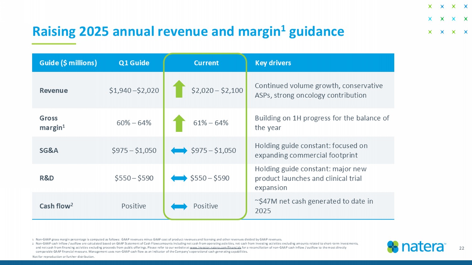 Key drivers Current Q1 Guide Guide ($ millions) Continued volume growth, conservative ASPs, strong oncology contribution $2,020 – $2,100 $ 1,940 – $2,020 Revenue Building on 1H progress for the balance of the year 61% – 64% 60% – 64% Gross margin 1 Holding guide constant: focused on expanding commercial footprint $ 975 – $ 1,050 $ 975 – $ 1,050 SG&A Holding guide constant: major new product launches and clinical trial expansion $ 550 – $ 590 $ 550 – $ 590 R&D ~$47M net cash generated to date in 2025 Positive Positive Cash flow 2 Raising 2025 annual revenue and margin 1 guidance Not for reproduction or further distribution. 22 1. Non - GAAP gross margin percentage is computed as follows: GAAP revenues minus GAAP cost of product revenues and licensing and ot her revenues divided by GAAP revenues. 2. Non - GAAP cash inflow / outflow are calculated based on GAAP Statement of Cash Flows amounts including net cash from operating ac tivities, net cash from investing activities excluding amounts related to short - term investments, and net cash from financing activities excluding proceeds from public offerings. Please refer to our website at www.investor.natera.com/financials for a reconciliation of non - GAAP cash inflow / outflow to the most directly comparable GAAP financial measure. Management uses non - GAAP cash flow as an indicator of the Company’s operational cash generati ng capabilities.