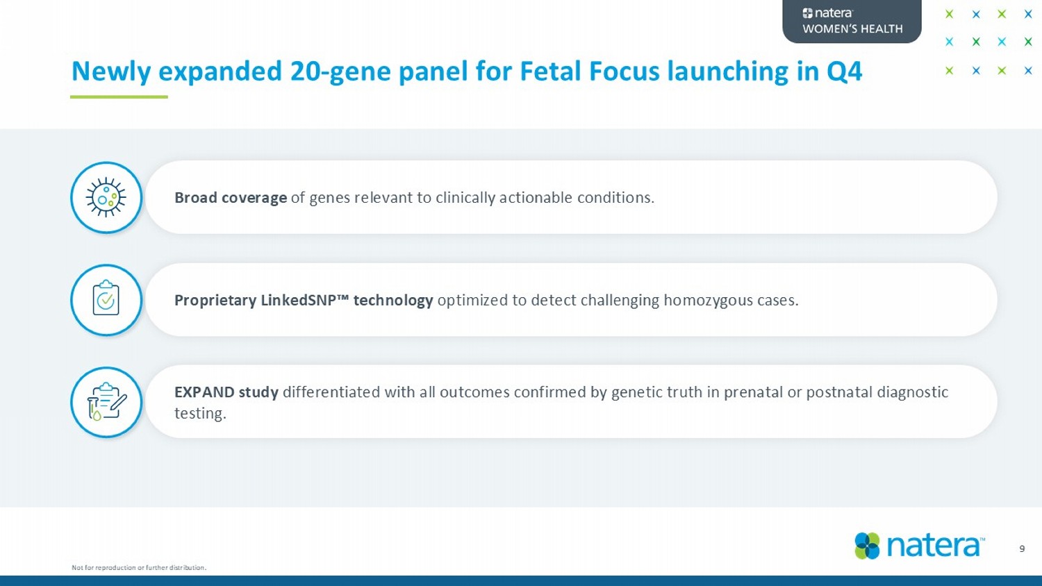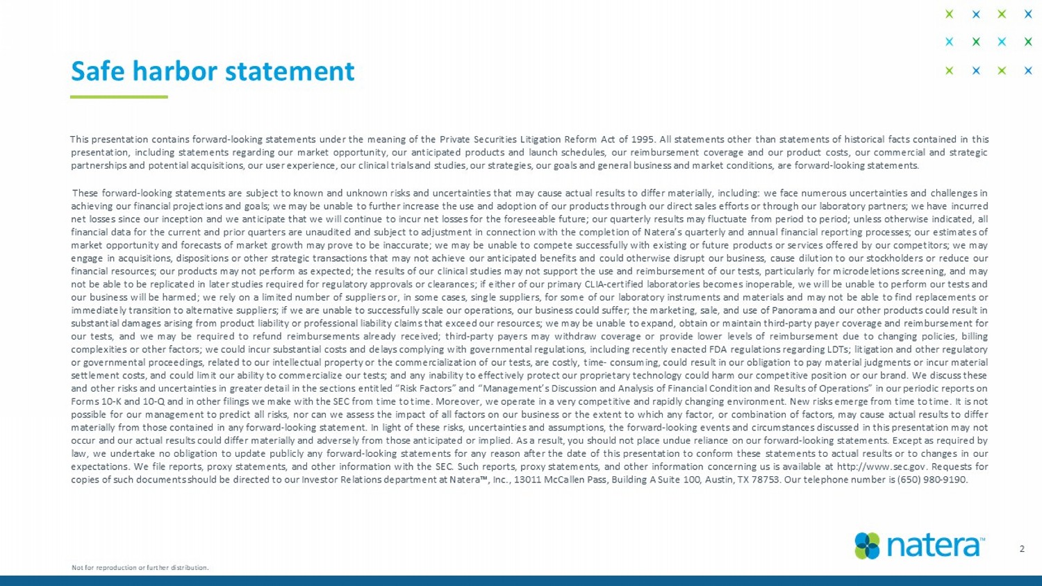 This presentation contains forward - looking statements under the meaning of the Private Securities Litigation Reform Act of 1995 . All statements other than statements of historical facts contained in this presentation, including statements regarding our market opportunity, our anticipated products and launch schedules, our reimbursement coverage and our product costs, our commercial and strategic partnerships and potential acquisitions, our user experience, our clinical trials and studies, our strategies, our goals and general business and market conditions, are forward - looking statements . These forward - looking statements are subject to known and unknown risks and uncertainties that may cause actual results to differ materially, including : we face numerous uncertainties and challenges in achieving our financial projections and goals ; we may be unable to further increase the use and adoption of our products through our direct sales efforts or through our laboratory partners ; we have incurred net losses since our inception and we anticipate that we will continue to incur net losses for the foreseeable future ; our quarterly results may fluctuate from period to period ; unless otherwise indicated, all financial data for the current and prior quarters are unaudited and subject to adjustment in connection with the completion of Natera’s quarterly and annual financial reporting processes ; our estimates of market opportunity and forecasts of market growth may prove to be inaccurate ; we may be unable to compete successfully with existing or future products or services offered by our competitors ; we may engage in acquisitions, dispositions or other strategic transactions that may not achieve our anticipated benefits and could otherwise disrupt our business, cause dilution to our stockholders or reduce our financial resources ; our products may not perform as expected ; the results of our clinical studies may not support the use and reimbursement of our tests, particularly for microdeletions screening, and may not be able to be replicated in later studies required for regulatory approvals or clearances ; if either of our primary CLIA - certified laboratories becomes inoperable, we will be unable to perform our tests and our business will be harmed ; we rely on a limited number of suppliers or, in some cases, single suppliers, for some of our laboratory instruments and materials and may not be able to find replacements or immediately transition to alternative suppliers ; if we are unable to successfully scale our operations, our business could suffer ; the marketing, sale, and use of Panorama and our other products could result in substantial damages arising from product liability or professional liability claims that exceed our resources ; we may be unable to expand, obtain or maintain third - party payer coverage and reimbursement for our tests, and we may be required to refund reimbursements already received ; third - party payers may withdraw coverage or provide lower levels of reimbursement due to changing policies, billing complexities or other factors ; we could incur substantial costs and delays complying with governmental regulations, including recently enacted FDA regulations regarding LDTs ; litigation and other regulatory or governmental proceedings, related to our intellectual property or the commercialization of our tests, are costly, time - consuming, could result in our obligation to pay material judgments or incur material settlement costs, and could limit our ability to commercialize our tests ; and any inability to effectively protect our proprietary technology could harm our competitive position or our brand . We discuss these and other risks and uncertainties in greater detail in the sections entitled “Risk Factors” and “Management’s Discussion and Analysis of Financial Condition and Results of Operations” in our periodic reports on Forms 10 - K and 10 - Q and in other filings we make with the SEC from time to time . Moreover, we operate in a very competitive and rapidly changing environment . New risks emerge from time to time . It is not possible for our management to predict all risks, nor can we assess the impact of all factors on our business or the extent to which any factor, or combination of factors, may cause actual results to differ materially from those contained in any forward - looking statement . In light of these risks, uncertainties and assumptions, the forward - looking events and circumstances discussed in this presentation may not occur and our actual results could differ materially and adversely from those anticipated or implied . As a result, you should not place undue reliance on our forward - looking statements . Except as required by law, we undertake no obligation to update publicly any forward - looking statements for any reason after the date of this presentation to conform these statements to actual results or to changes in our expectations . We file reports, proxy statements, and other information with the SEC . Such reports, proxy statements, and other information concerning us is available at http : //www . sec . gov . Requests for copies of such documents should be directed to our Investor Relations department at Natera , Inc . , 13011 McCallen Pass, Building A Suite 100 , Austin, TX 78753 . Our telephone number is ( 650 ) 980 - 9190 . 2 Safe harbor statement Not for reproduction or further distribution.