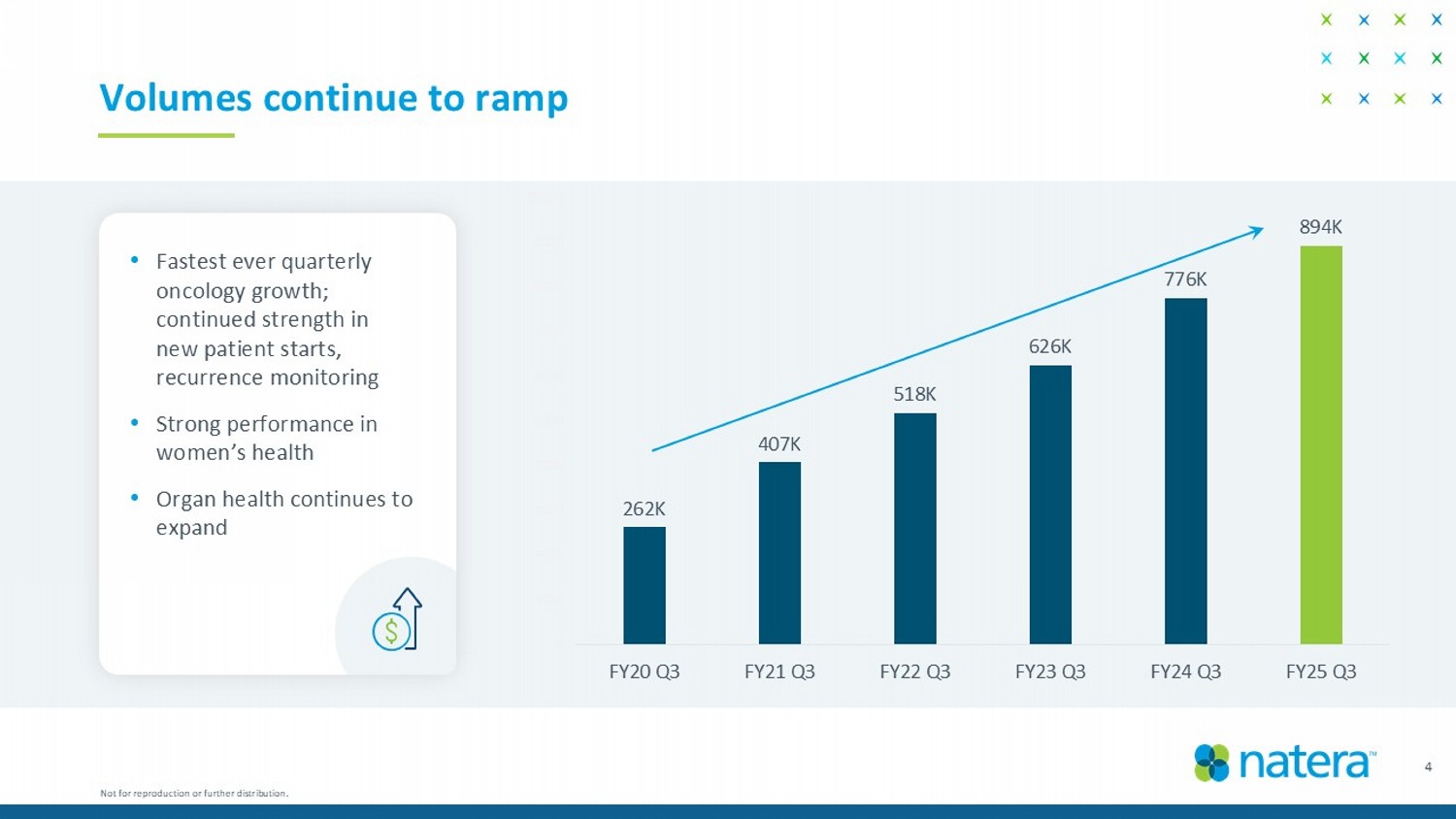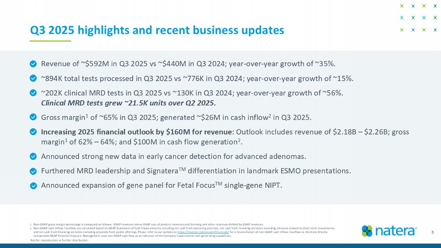 3 Q3 2025 highlights and recent business updates Not for reproduction or further distribution. 1. Non - GAAP gross margin percentage is computed as follows: GAAP revenues minus GAAP cost of product revenues and licensing and ot her revenues divided by GAAP revenues. 2. Non - GAAP cash inflow / outflow are calculated based on GAAP Statement of Cash Flows amounts including net cash from operating ac tivities, net cash from investing activities excluding amounts related to short - term investments, and net cash from financing activities excluding proceeds from public offerings. Please refer to our website at https://investor.natera.com/financials/ for a reconciliation of non - GAAP cash inflow / outflow to the most directly comparable GAAP financial measure. Management uses non - GAAP cash flow as an indicator of the Company’s operational cash generati ng capabilities. Revenue of ~$592M in Q3 2025 vs ~$440M in Q3 2024; year - over - year growth of ~35%. ~894K total tests processed in Q3 2025 vs ~776K in Q3 2024; year - over - year growth of ~15%. ~202K clinical MRD tests in Q3 2025 vs ~130K in Q3 2024; year - over - year growth of ~56%. Clinical MRD tests grew ~21.5K units over Q2 2025. Gross margin 1 of ~65% in Q3 2025; generated ~$26M in cash inflow 2 in Q3 2025. Increasing 2025 financial outlook by $160M for revenue : Outlook includes revenue of $2.18B – $2.26B; gross margin 1 of 62% – 64%; and $100M in cash flow generation 2 . Announced strong new data in early cancer detection for advanced adenomas. Furthered MRD leadership and Signatera TM differentiation in landmark ESMO presentations. Announced expansion of gene panel for Fetal Focus TM single - gene NIPT.