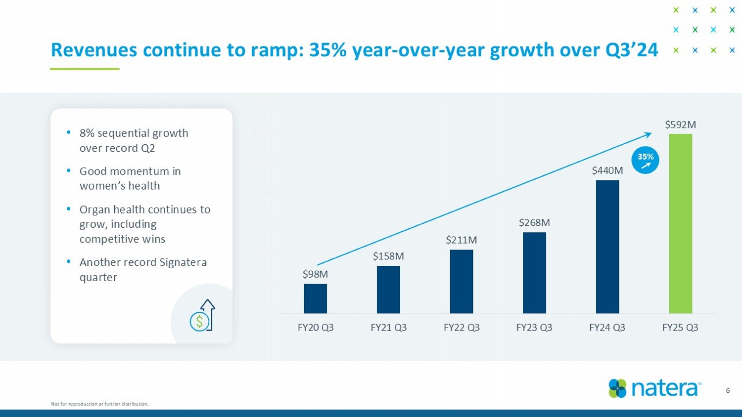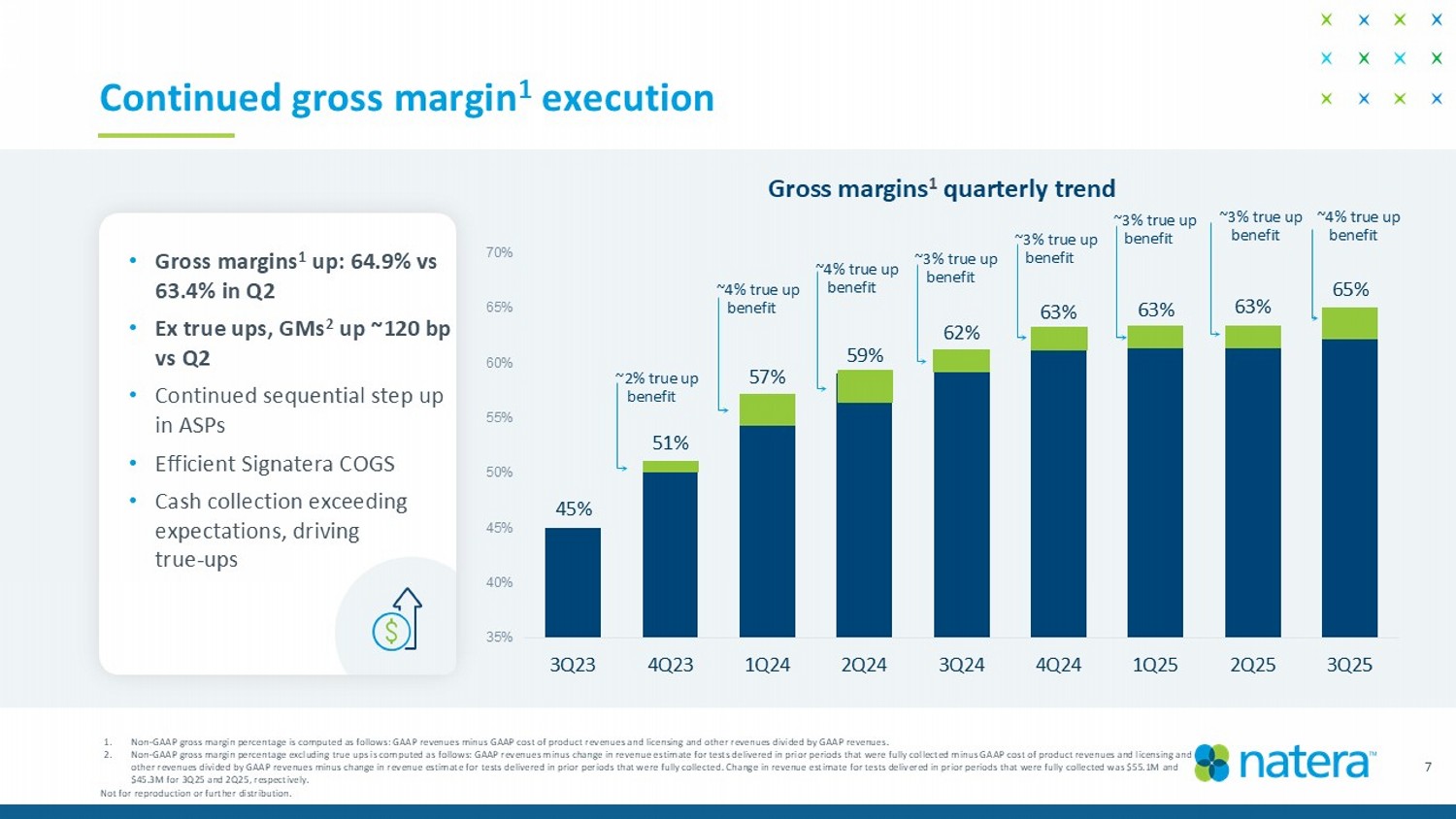 $98M $158M $211M $268M $440M $592M $M $100M $200M $300M $400M $500M $600M $700M FY20 Q3 FY21 Q3 FY22 Q3 FY23 Q3 FY24 Q3 FY25 Q3 Revenues continue to ramp: 35% year - over - year growth over Q3’24 35% 6 • 8% sequential growth over record Q2 • Good momentum in women’s health • Organ health continues to grow, including competitive wins • Another record Signatera quarter Not for reproduction or further distribution.
