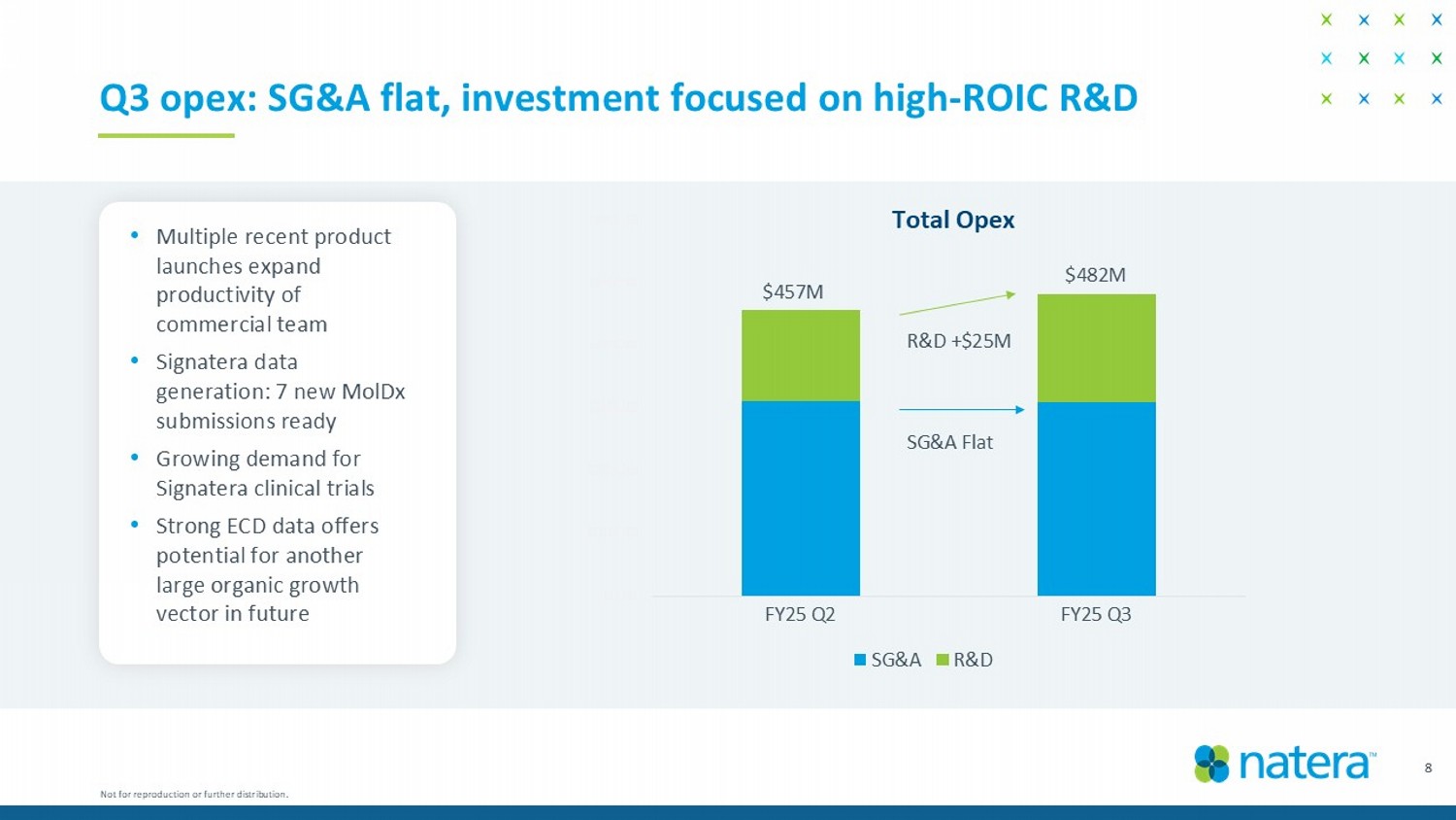 45% 51% 57% 59% 62% 63% 63% 63% 65% 35% 40% 45% 50% 55% 60% 65% 70% 3Q23 4Q23 1Q24 2Q24 3Q24 4Q24 1Q25 2Q25 3Q25 7 Continued gross margin 1 execution ~ 2 % true up benefit ~4% true up benefit ~4% true up benefit ~3% true up benefit ~3% true up benefit ~3% true up benefit ~3% true up benefit ~4% true up benefit • Gross margins 1 up: 64.9% vs 63.4% in Q2 • Ex true ups, GMs 2 up ~120 bp vs Q2 • Continued sequential step up in ASPs • Efficient Signatera COGS • Cash collection exceeding expectations, driving true - ups 1. Non - GAAP gross margin percentage is computed as follows: GAAP revenues minus GAAP cost of product revenues and licensing and oth er revenues divided by GAAP revenues. 2. Non - GAAP gross margin percentage excluding true ups is computed as follows: GAAP revenues minus change in revenue estimate for t ests delivered in prior periods that were fully collected minus GAAP cost of product revenues and licensing and other revenues divided by GAAP revenues minus change in revenue estimate for tests delivered in prior periods that were fully co llected. Change in revenue estimate for tests delivered in prior periods that were fully collected was $55.1M and $45.3M for 3Q25 and 2Q25, respectively. Gross margins 1 quarterly trend Not for reproduction or further distribution.