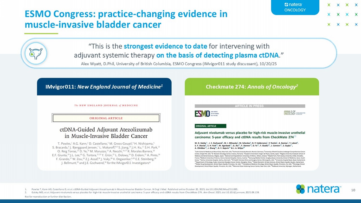 10 ESMO Congress: practice - changing evidence in muscle - invasive bladder cancer “This is the strongest evidence to date for intervening with adjuvant systemic therapy on the basis of detecting plasma ctDNA .” Alex Wyatt, D.Phil, University of British Columbia, ESMO Congress (IMvigor011 study discussant), 10/20/25 Checkmate 274: Annals of Oncology 2 IMvigor011: New England Journal of Medicine 1 1. Powles T, Kann AG, Castellano D, et al. ctDNA - Guided Adjuvant Atezolizumab in Muscle - Invasive Bladder Cancer. N Engl J Med . Published online October 20, 2025; doi:10.1056/NEJMoa2511885. 2. Galsky MD, et al. Adjuvant nivolumab versus placebo for high - risk muscle - invasive urothelial carcinoma: 5 - year efficacy and ctDNA resu lts from CheckMate 274. Ann Oncol. 2025; doi:10.1016/j.annonc.2025.09.139. Not for reproduction or further distribution.