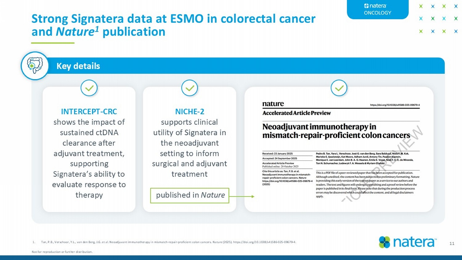 Strong Signatera data at ESMO in colorectal cancer and Nature 1 publication Key details INTERCEPT - CRC shows the impact of sustained ctDNA clearance after adjuvant treatment, supporting Signatera’s ability to evaluate response to therapy 11 NICHE - 2 supports clinical utility of Signatera in the neoadjuvant setting to inform surgical and adjuvant treatment published in Nature 1. Tan, P.B., Verschoor, Y.L ., van den Berg, J.G. et al. Neoadjuvant immunotherapy in mismatch - repair - proficient colon cancers. Nature (2025). https://doi.o rg/10.1038/s41586 - 025 - 09679 - 4. Not for reproduction or further distribution.