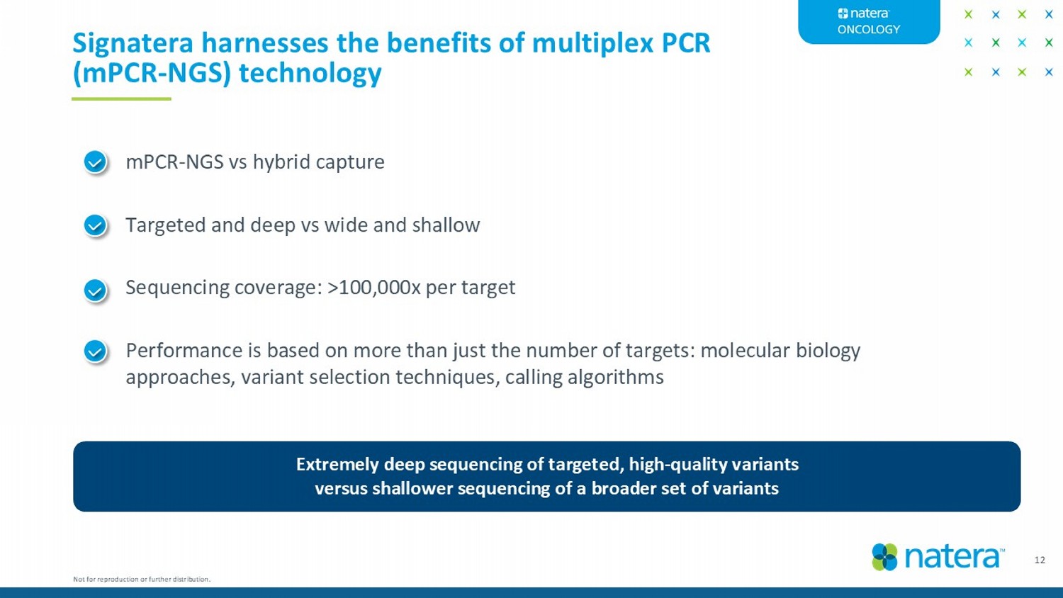 Signatera harnesses the benefits of multiplex PCR ( mPCR - NGS) technology Extremely deep sequencing of targeted, high - quality variants versus shallower sequencing of a broader set of variants 12 Not for reproduction or further distribution. mPCR - NGS vs hybrid capture Targeted and deep vs wide and shallow Performance is based on more than just the number of targets: molecular biology approaches, variant selection techniques, calling algorithms Sequencing coverage: >100,000x per target