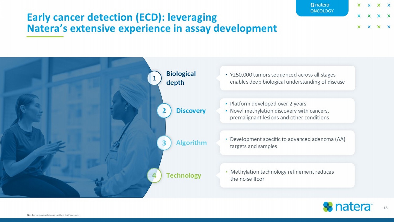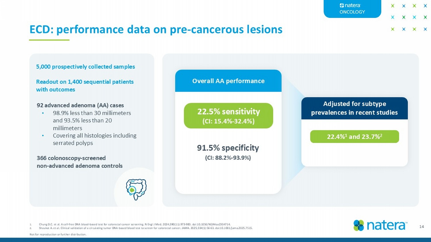 Early cancer detection (ECD): leveraging Natera’s extensive experience in assay development • >250,000 tumors sequenced across all stages enables deep biological understanding of disease • Platform developed over 2 years • Novel methylation discovery with cancers, premalignant lesions and other conditions • Development specific to advanced adenoma (AA) targets and samples • Methylation technology refinement reduces the noise floor Biological depth Discovery Algorithm Technology 1 2 4 3 13 Not for reproduction or further distribution.