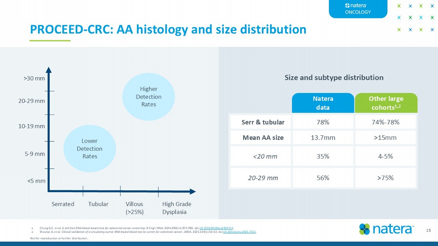 15 PROCEED - CRC: AA histology and size distribution 74% - 78% 78% Serr & tubular >15mm 13.7mm Mean AA size 4 - 5% 35% <20 mm >75% 56% 20 - 29 mm Natera data Other large cohorts 1,2 Serrated Tubular Villous (>25%) High Grade Dysplasia >30 mm 20 - 29 mm 10 - 19 mm 5 - 9 mm <5 mm Higher Detection Rates Lower Detection Rates Size and subtype distribution 1. Chung D.C. et al. A cell - free DNA blood - based test for colorectal cancer screening. N Engl J Med. 2024;390(11):973 - 983. doi: 10.1056/NEJMoa2304714 . 2. Shaukat A. et al. Clinical validation of a circulating tumor DNA - based blood test to screen for colorectal cancer. JAMA. 2025;334(1):56 - 63. doi: 10.1001/jama.2025.7515 . Not for reproduction or further distribution.