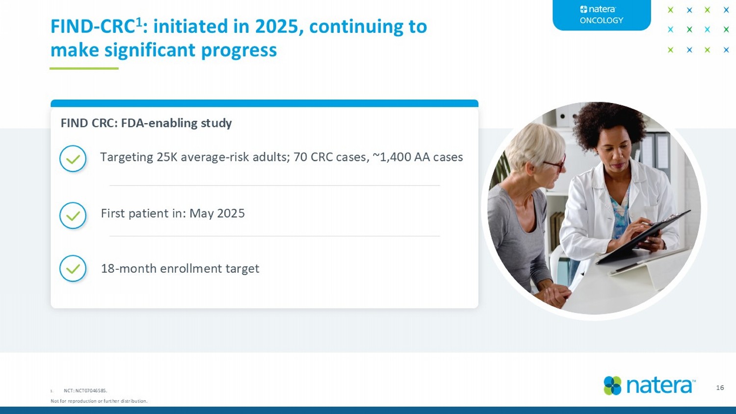 16 1. NCT : NCT07046585. FIND - CRC 1 : initiated in 2025, continuing to make significant progress Targeting 25K average - risk adults; 70 CRC cases, ~1,400 AA cases FIND CRC: FDA - enabling study First patient in: May 2025 18 - month enrollment target Not for reproduction or further distribution.