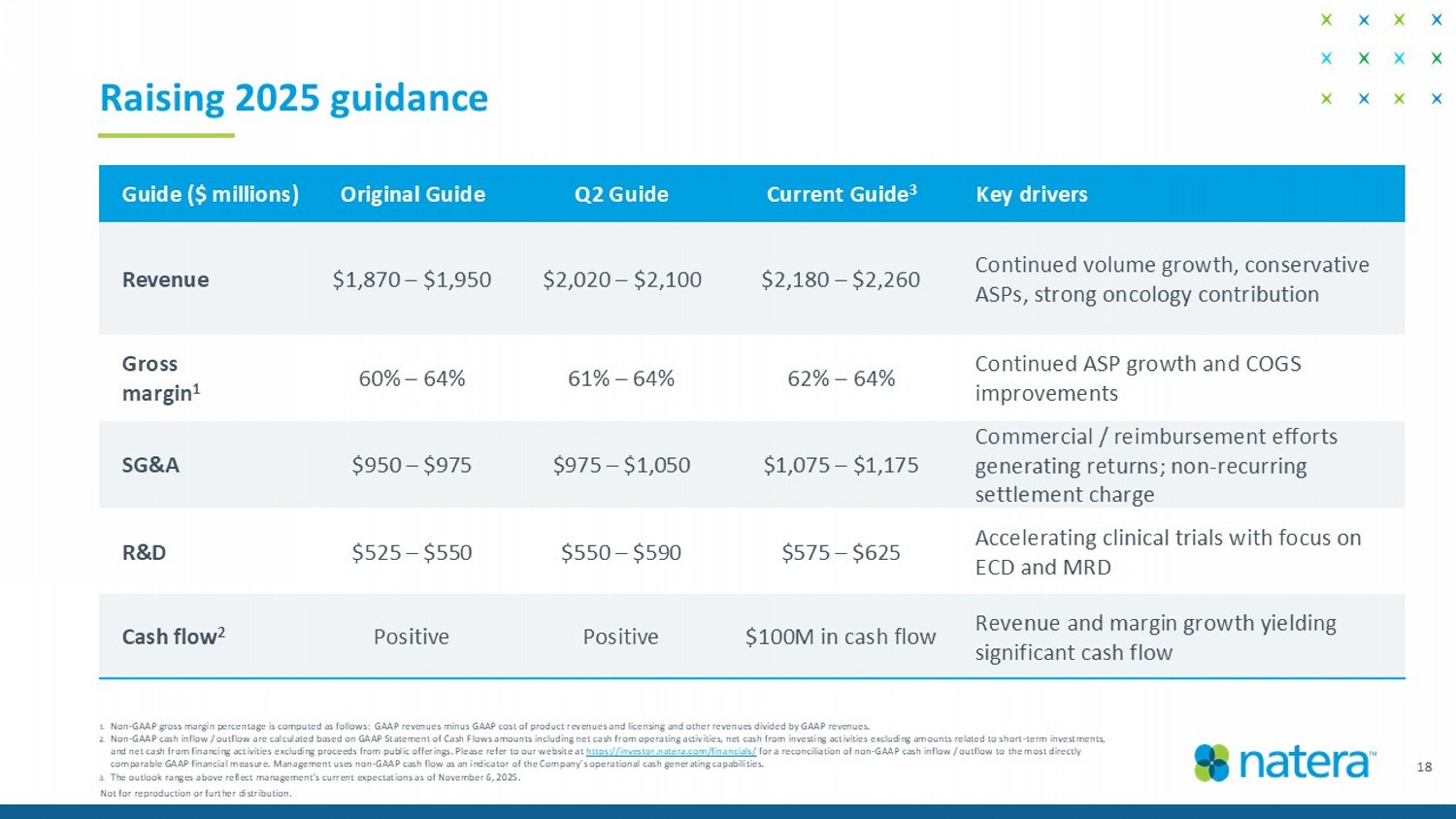 Key drivers Current Guide 3 Q2 Guide Original Guide Guide ($ millions) Continued volume growth, conservative ASPs, strong oncology contribution $2,180 – $2,260 $2,020 – $2,100 $1,870 – $1,950 Revenue Continued ASP growth and COGS improvements 62% – 64% 61% – 64% 60% – 64% Gross margin 1 Commercial / reimbursement efforts generating returns; non - recurring settlement charge $ 1,075 – $ 1,175 $ 975 – $ 1,050 $ 950 – $ 975 SG&A Accelerating clinical trials with focus on ECD and MRD $ 575 – $ 625 $ 550 – $ 590 $ 525 – $ 550 R&D Revenue and margin growth yielding significant cash flow $100M in cash flow Positive Positive Cash flow 2 Raising 2025 guidance Not for reproduction or further distribution. 18 1. Non - GAAP gross margin percentage is computed as follows: GAAP revenues minus GAAP cost of product revenues and licensing and ot her revenues divided by GAAP revenues. 2. Non - GAAP cash inflow / outflow are calculated based on GAAP Statement of Cash Flows amounts including net cash from operating ac tivities, net cash from investing activities excluding amounts related to short - term investments, and net cash from financing activities excluding proceeds from public offerings. Please refer to our website at https://investor.natera.com/financials/ for a reconciliation of non - GAAP cash inflow / outflow to the most directly comparable GAAP financial measure. Management uses non - GAAP cash flow as an indicator of the Company’s operational cash generati ng capabilities. 3. The outlook ranges above reflect management’s current expectations as of November 6, 2025.