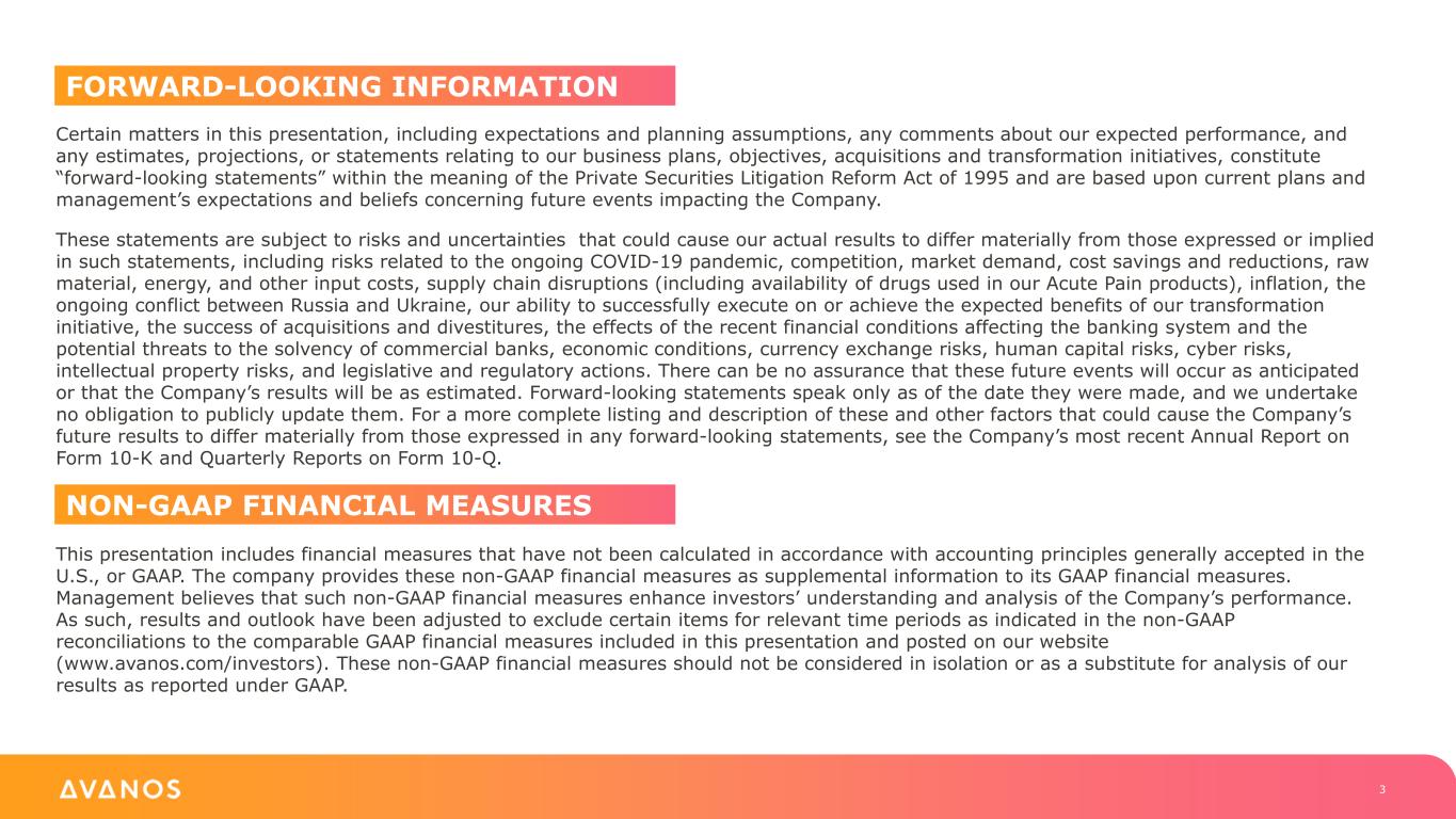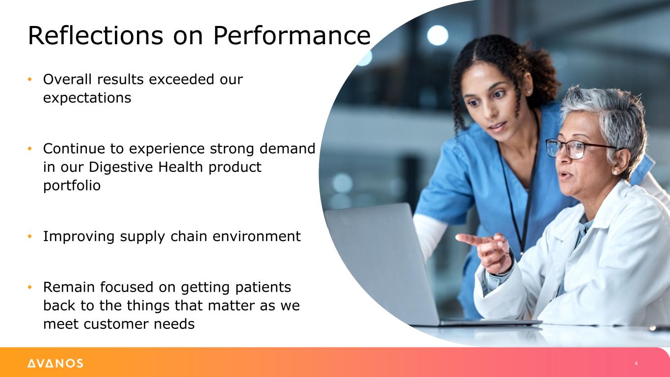 3 FORWARD-LOOKING INFORMATION NON-GAAP FINANCIAL MEASURES Certain matters in this presentation, including expectations and planning assumptions, any comments about our expected performance, and any estimates, projections, or statements relating to our business plans, objectives, acquisitions and transformation initiatives, constitute “forward-looking statements” within the meaning of the Private Securities Litigation Reform Act of 1995 and are based upon current plans and management’s expectations and beliefs concerning future events impacting the Company. These statements are subject to risks and uncertainties that could cause our actual results to differ materially from those expressed or implied in such statements, including risks related to the ongoing COVID-19 pandemic, competition, market demand, cost savings and reductions, raw material, energy, and other input costs, supply chain disruptions (including availability of drugs used in our Acute Pain products), inflation, the ongoing conflict between Russia and Ukraine, our ability to successfully execute on or achieve the expected benefits of our transformation initiative, the success of acquisitions and divestitures, the effects of the recent financial conditions affecting the banking system and the potential threats to the solvency of commercial banks, economic conditions, currency exchange risks, human capital risks, cyber risks, intellectual property risks, and legislative and regulatory actions. There can be no assurance that these future events will occur as anticipated or that the Company’s results will be as estimated. Forward-looking statements speak only as of the date they were made, and we undertake no obligation to publicly update them. For a more complete listing and description of these and other factors that could cause the Company’s future results to differ materially from those expressed in any forward-looking statements, see the Company’s most recent Annual Report on Form 10-K and Quarterly Reports on Form 10-Q. This presentation includes financial measures that have not been calculated in accordance with accounting principles generally accepted in the U.S., or GAAP. The company provides these non-GAAP financial measures as supplemental information to its GAAP financial measures. Management believes that such non-GAAP financial measures enhance investors’ understanding and analysis of the Company’s performance. As such, results and outlook have been adjusted to exclude certain items for relevant time periods as indicated in the non-GAAP reconciliations to the comparable GAAP financial measures included in this presentation and posted on our website (www.avanos.com/investors). These non-GAAP financial measures should not be considered in isolation or as a substitute for analysis of our results as reported under GAAP.