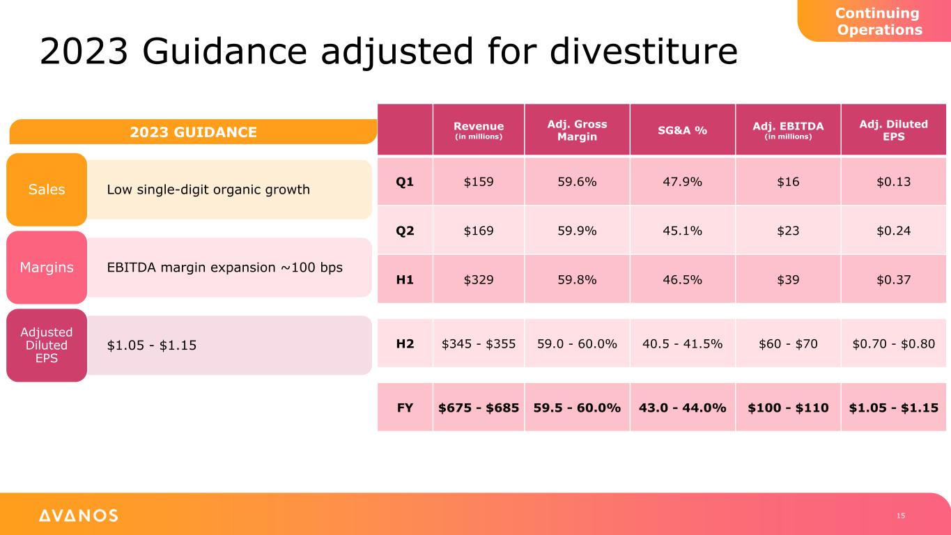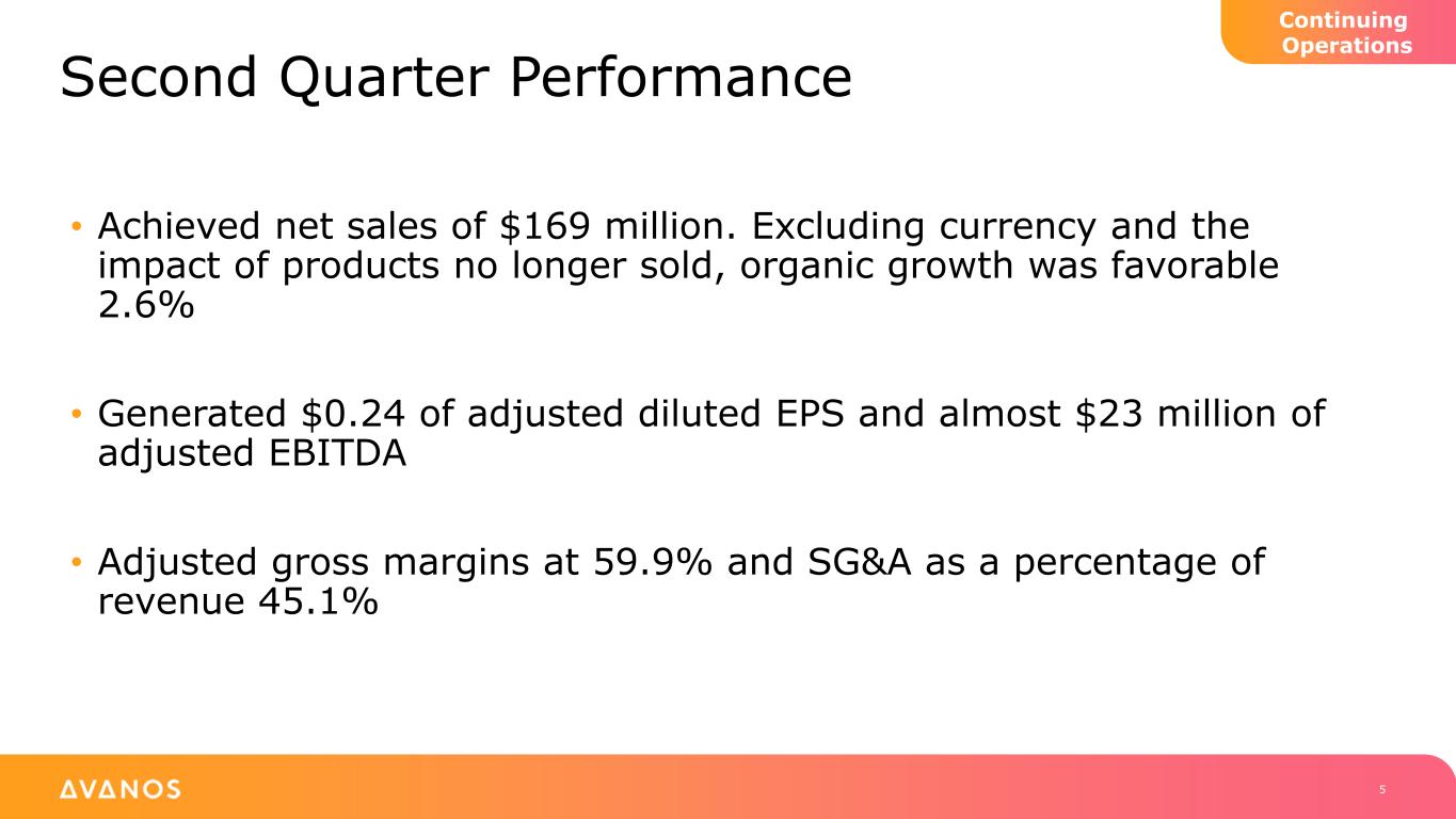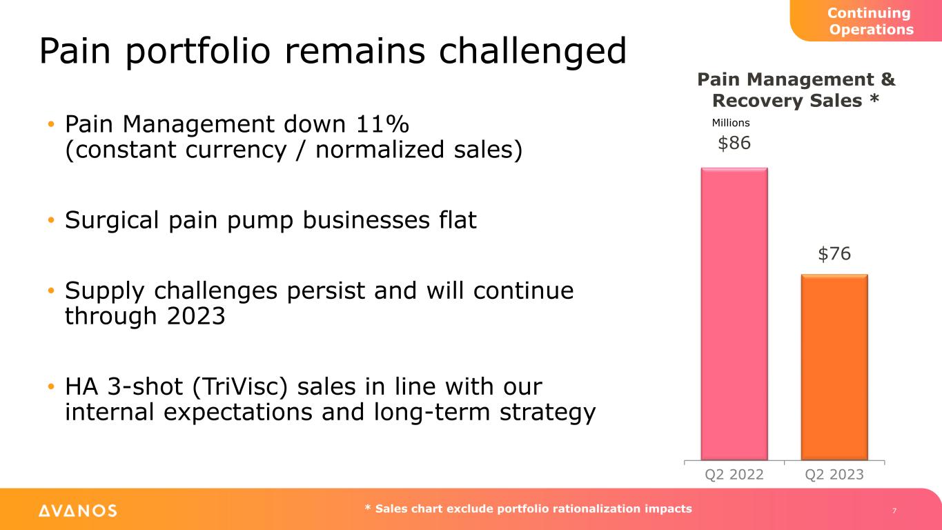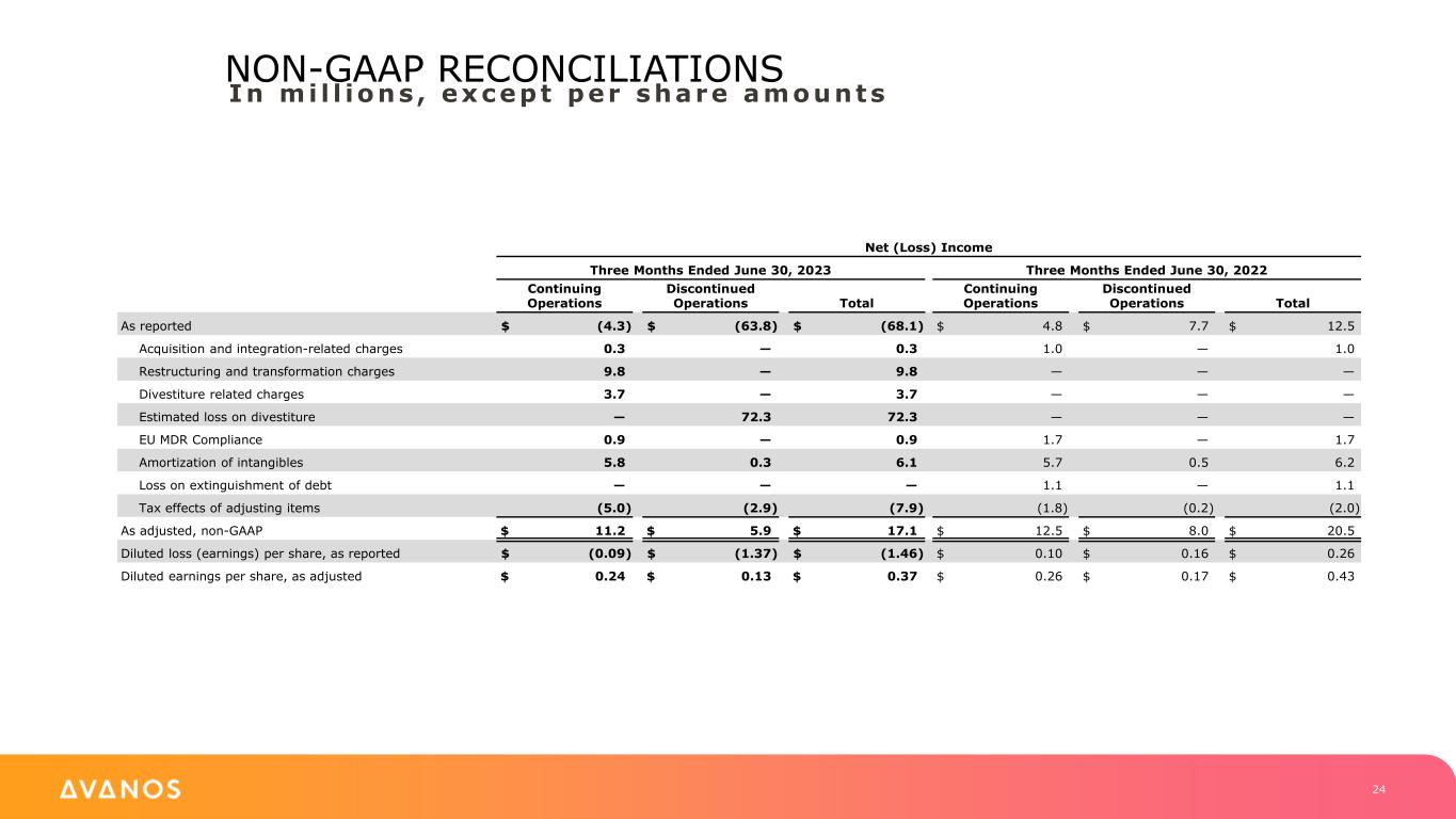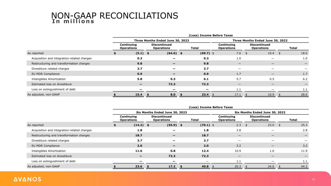 NON-GAAP RECONCILIATIONS In mi l l ions (Loss) Income Before Taxes Three Months Ended June 30, 2023 Three Months Ended June 30, 2022 Continuing Operations Discontinued Operations Total Continuing Operations Discontinued Operations Total As reported $ (5.1) $ (64.6) $ (69.7) $ 7.6 $ 10.4 $ 18.0 Acquisition and integration-related charges 0.3 — 0.3 1.0 — 1.0 Restructuring and transformation charges 9.8 — 9.8 — — — Divestiture related charges 3.7 — 3.7 — — — EU MDR Compliance 0.9 — 0.9 1.7 — 1.7 Intangibles Amortization 5.8 0.3 6.1 5.7 0.5 6.2 Estimated loss on divestiture — 72.3 72.3 — — — Loss on extinguishment of debt — — — 1.1 — 1.1 As adjusted, non-GAAP $ 15.4 $ 8.0 $ 23.4 $ 17.1 $ 10.9 $ 28.0 (Loss) Income Before Taxes Six Months Ended June 30, 2023 Six Months Ended June 30, 2022 Continuing Operations Discontinued Operations Total Continuing Operations Discontinued Operations Total As reported $ (14.2) $ (55.9) $ (70.1) $ 2.3 $ 23.0 $ 25.3 Acquisition and integration-related charges 1.8 — 1.8 2.8 — 2.8 Restructuring and transformation charges 18.7 — 18.7 — — — Divestiture related charges 3.7 — 3.7 — — — EU MDR Compliance 2.0 — 2.0 3.2 — 3.2 Intangibles Amortization 11.6 0.8 12.4 10.9 1.0 11.9 Estimated loss on divestiture — 72.3 72.3 — — — Loss on extinguishment of debt — — — 1.1 — 1.1 As adjusted, non-GAAP $ 23.6 $ 17.2 $ 40.8 $ 20.3 $ 24.0 $ 44.3 22