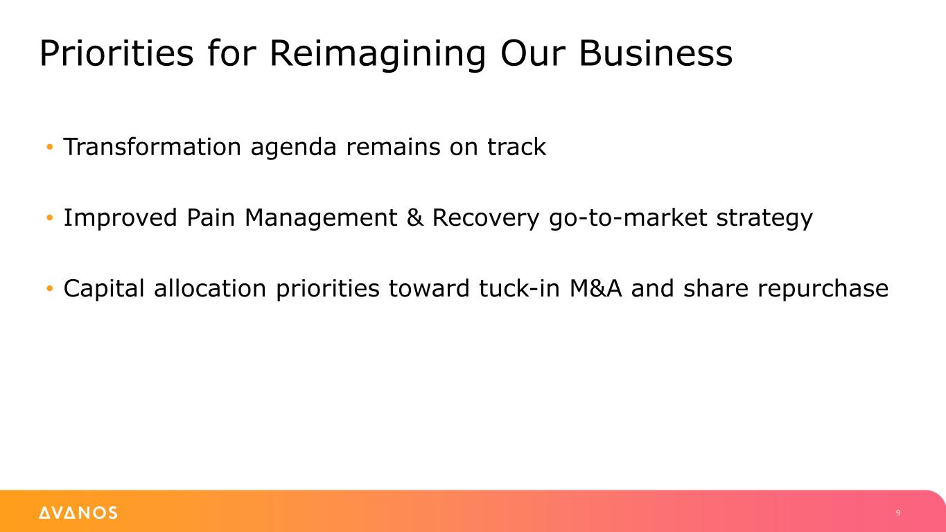 9 Priorities for Reimagining Our Business • Transformation agenda remains on track • Improved Pain Management & Recovery go-to-market strategy • Capital allocation priorities toward tuck-in M&A and share repurchase