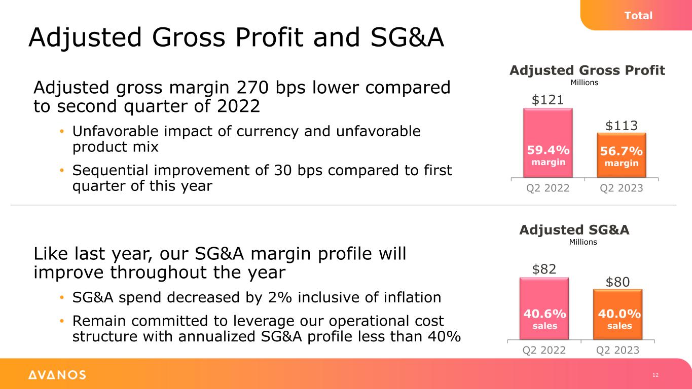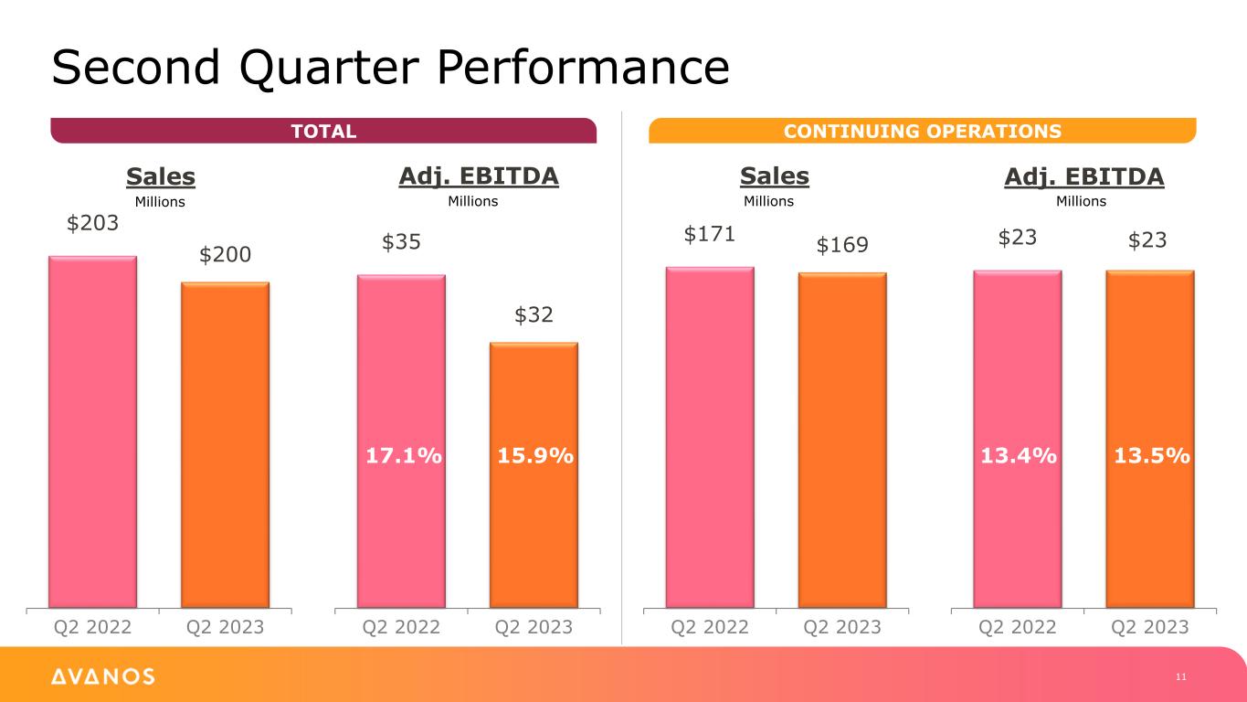 11 $203 $200 Q2 2022 Q2 2023 $35 $32 Q2 2022 Q2 2023 $171 $169 Q2 2022 Q2 2023 $23 $23 Q2 2022 Q2 2023 Second Quarter Performance 17.1% 15.9% TOTAL CONTINUING OPERATIONS Sales Adj. EBITDA Sales Adj. EBITDA Millions Millions Millions Millions 13.4% 13.5%
