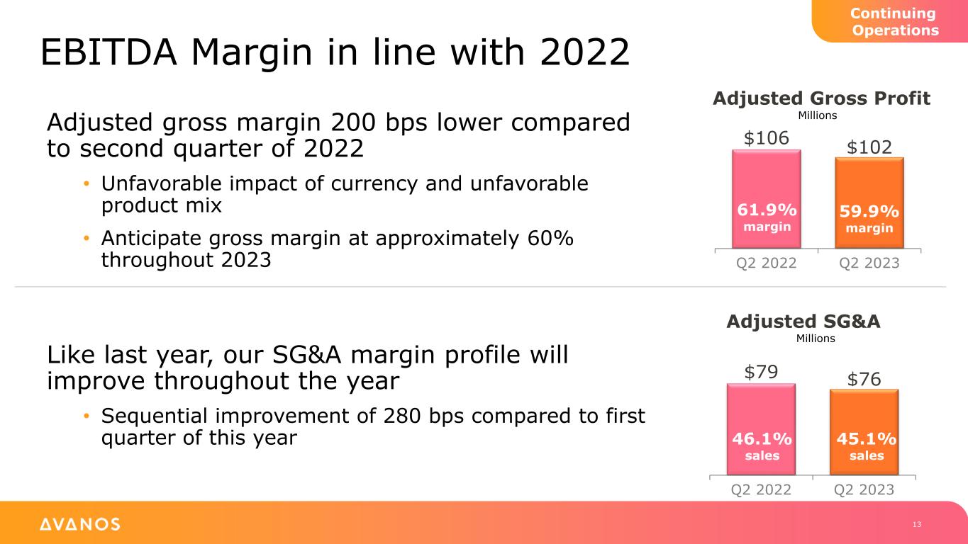 12 Adjusted gross margin 270 bps lower compared to second quarter of 2022 • Unfavorable impact of currency and unfavorable product mix • Sequential improvement of 30 bps compared to first quarter of this year Adjusted Gross Profit and SG&A $121 $113 Q2 2022 Q2 2023 Adjusted Gross Profit Millions 59.4% margin 56.7% margin $82 $80 Q2 2022 Q2 2023 Adjusted SG&A Millions 40.6% sales 40.0% sales Total Like last year, our SG&A margin profile will improve throughout the year • SG&A spend decreased by 2% inclusive of inflation • Remain committed to leverage our operational cost structure with annualized SG&A profile less than 40%