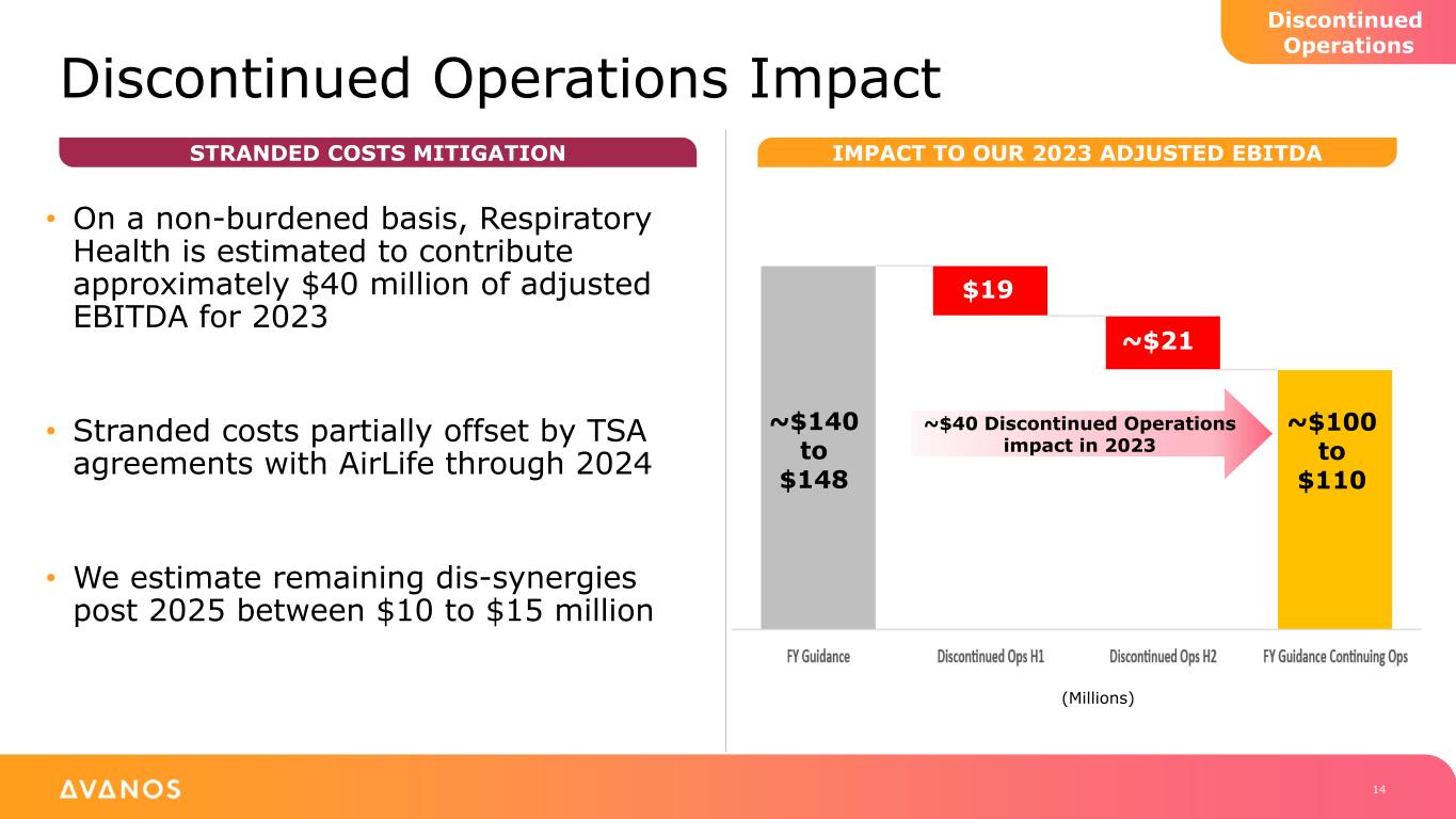 13 Adjusted gross margin 200 bps lower compared to second quarter of 2022 • Unfavorable impact of currency and unfavorable product mix • Anticipate gross margin at approximately 60% throughout 2023 EBITDA Margin in line with 2022 $106 $102 Q2 2022 Q2 2023 Adjusted Gross Profit Millions 61.9% margin 59.9% margin $79 $76 Q2 2022 Q2 2023 Adjusted SG&A Millions 46.1% sales 45.1% sales Continuing Operations Like last year, our SG&A margin profile will improve throughout the year • Sequential improvement of 280 bps compared to first quarter of this year