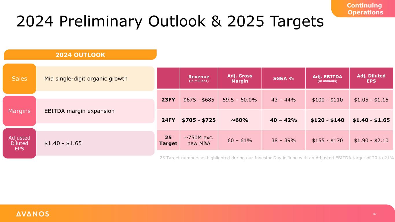 2024 Preliminary Outlook & 2025 Targets 16 Continuing Operations Mid single-digit organic growthSales EBITDA margin expansionMargins $1.40 - $1.65 Adjusted Diluted EPS Revenue (in millions) Adj. Gross Margin SG&A % Adj. EBITDA (in millions) Adj. Diluted EPS 23FY $675 - $685 59.5 – 60.0% 43 – 44% $100 - $110 $1.05 - $1.15 24FY $705 - $725 ~60% 40 – 42% $120 - $140 $1.40 - $1.65 25 Target ~750M exc. new M&A 60 – 61% 38 – 39% $155 - $170 $1.90 - $2.10 25 Target numbers as highlighted during our Investor Day in June with an Adjusted EBITDA target of 20 to 21% 2024 OUTLOOK