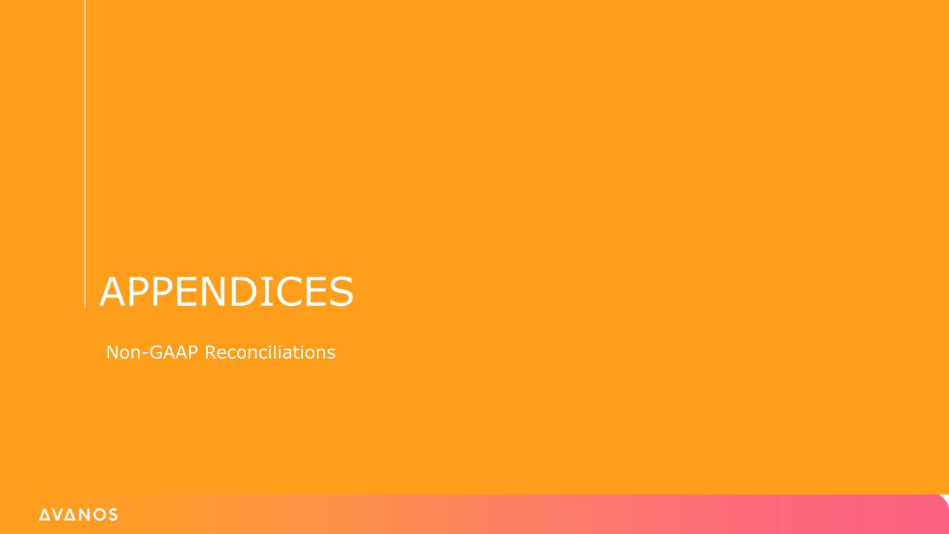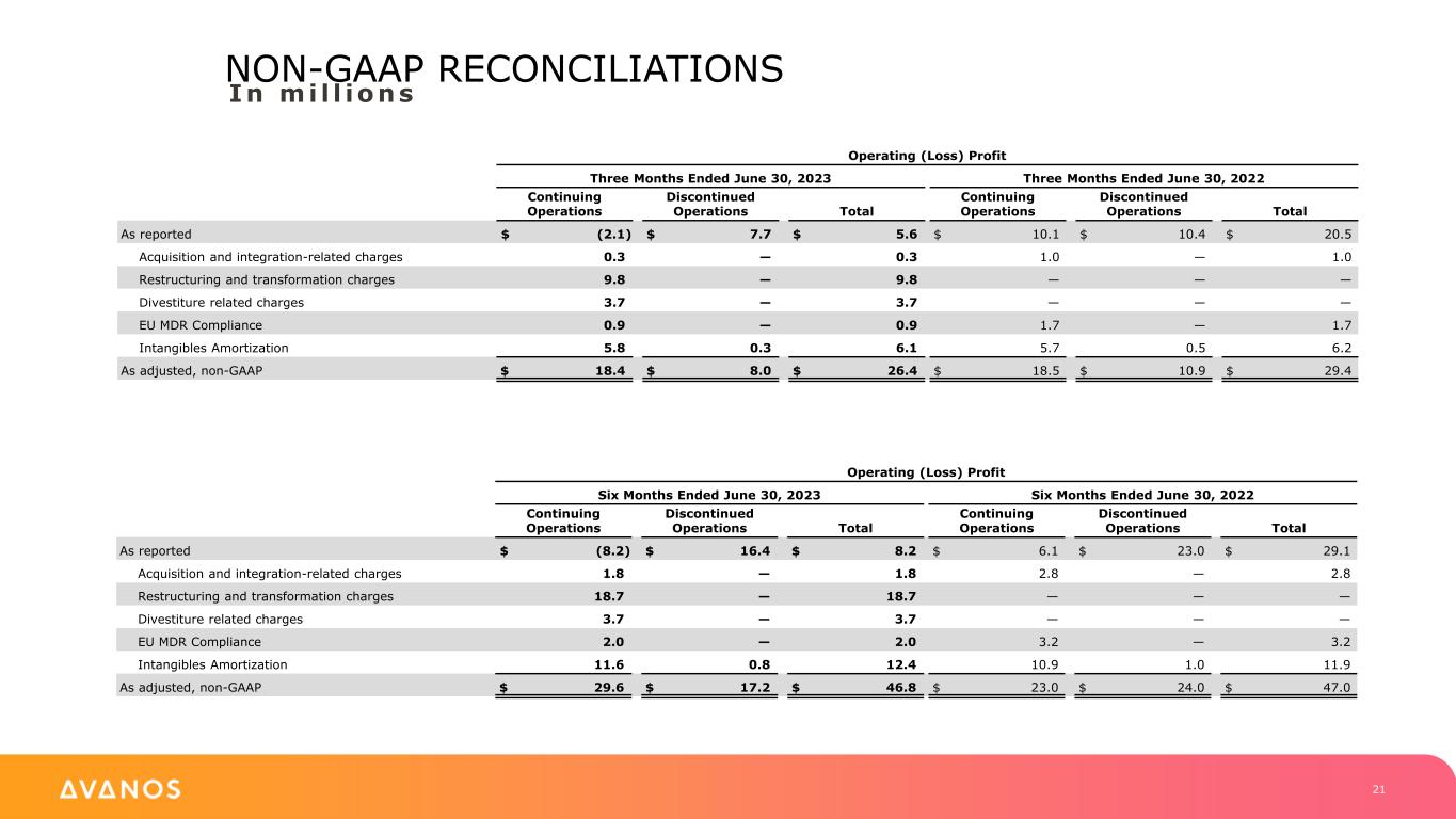 NON-GAAP RECONCILIATIONS In mi l l ions Operating (Loss) Profit Three Months Ended June 30, 2023 Three Months Ended June 30, 2022 Continuing Operations Discontinued Operations Total Continuing Operations Discontinued Operations Total As reported $ (2.1) $ 7.7 $ 5.6 $ 10.1 $ 10.4 $ 20.5 Acquisition and integration-related charges 0.3 — 0.3 1.0 — 1.0 Restructuring and transformation charges 9.8 — 9.8 — — — Divestiture related charges 3.7 — 3.7 — — — EU MDR Compliance 0.9 — 0.9 1.7 — 1.7 Intangibles Amortization 5.8 0.3 6.1 5.7 0.5 6.2 As adjusted, non-GAAP $ 18.4 $ 8.0 $ 26.4 $ 18.5 $ 10.9 $ 29.4 Operating (Loss) Profit Six Months Ended June 30, 2023 Six Months Ended June 30, 2022 Continuing Operations Discontinued Operations Total Continuing Operations Discontinued Operations Total As reported $ (8.2) $ 16.4 $ 8.2 $ 6.1 $ 23.0 $ 29.1 Acquisition and integration-related charges 1.8 — 1.8 2.8 — 2.8 Restructuring and transformation charges 18.7 — 18.7 — — — Divestiture related charges 3.7 — 3.7 — — — EU MDR Compliance 2.0 — 2.0 3.2 — 3.2 Intangibles Amortization 11.6 0.8 12.4 10.9 1.0 11.9 As adjusted, non-GAAP $ 29.6 $ 17.2 $ 46.8 $ 23.0 $ 24.0 $ 47.0 21