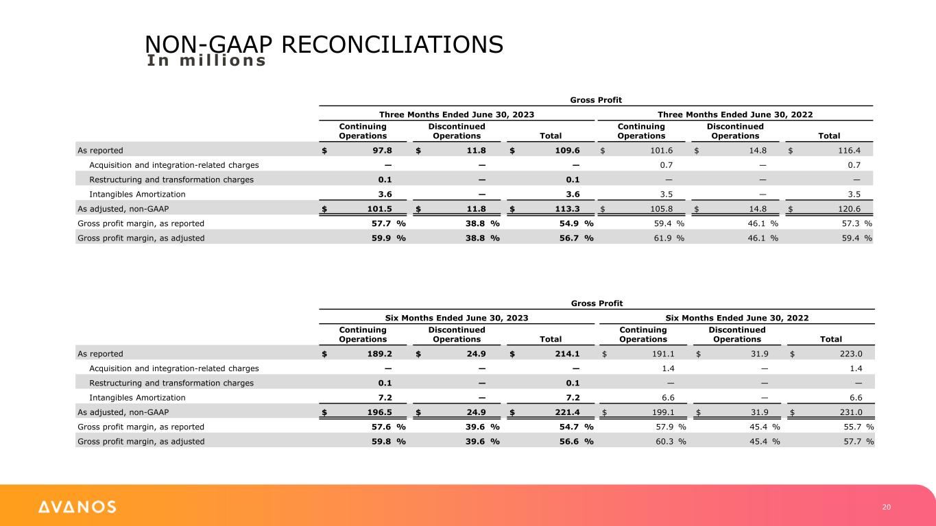NON-GAAP RECONCILIATIONS In mi l l ions Gross Profit Three Months Ended June 30, 2023 Three Months Ended June 30, 2022 Continuing Operations Discontinued Operations Total Continuing Operations Discontinued Operations Total As reported $ 97.8 $ 11.8 $ 109.6 $ 101.6 $ 14.8 $ 116.4 Acquisition and integration-related charges — — — 0.7 — 0.7 Restructuring and transformation charges 0.1 — 0.1 — — — Intangibles Amortization 3.6 — 3.6 3.5 — 3.5 As adjusted, non-GAAP $ 101.5 $ 11.8 $ 113.3 $ 105.8 $ 14.8 $ 120.6 Gross profit margin, as reported 57.7 % 38.8 % 54.9 % 59.4 % 46.1 % 57.3 % Gross profit margin, as adjusted 59.9 % 38.8 % 56.7 % 61.9 % 46.1 % 59.4 % Gross Profit Six Months Ended June 30, 2023 Six Months Ended June 30, 2022 Continuing Operations Discontinued Operations Total Continuing Operations Discontinued Operations Total As reported $ 189.2 $ 24.9 $ 214.1 $ 191.1 $ 31.9 $ 223.0 Acquisition and integration-related charges — — — 1.4 — 1.4 Restructuring and transformation charges 0.1 — 0.1 — — — Intangibles Amortization 7.2 — 7.2 6.6 — 6.6 As adjusted, non-GAAP $ 196.5 $ 24.9 $ 221.4 $ 199.1 $ 31.9 $ 231.0 Gross profit margin, as reported 57.6 % 39.6 % 54.7 % 57.9 % 45.4 % 55.7 % Gross profit margin, as adjusted 59.8 % 39.6 % 56.6 % 60.3 % 45.4 % 57.7 % 20
