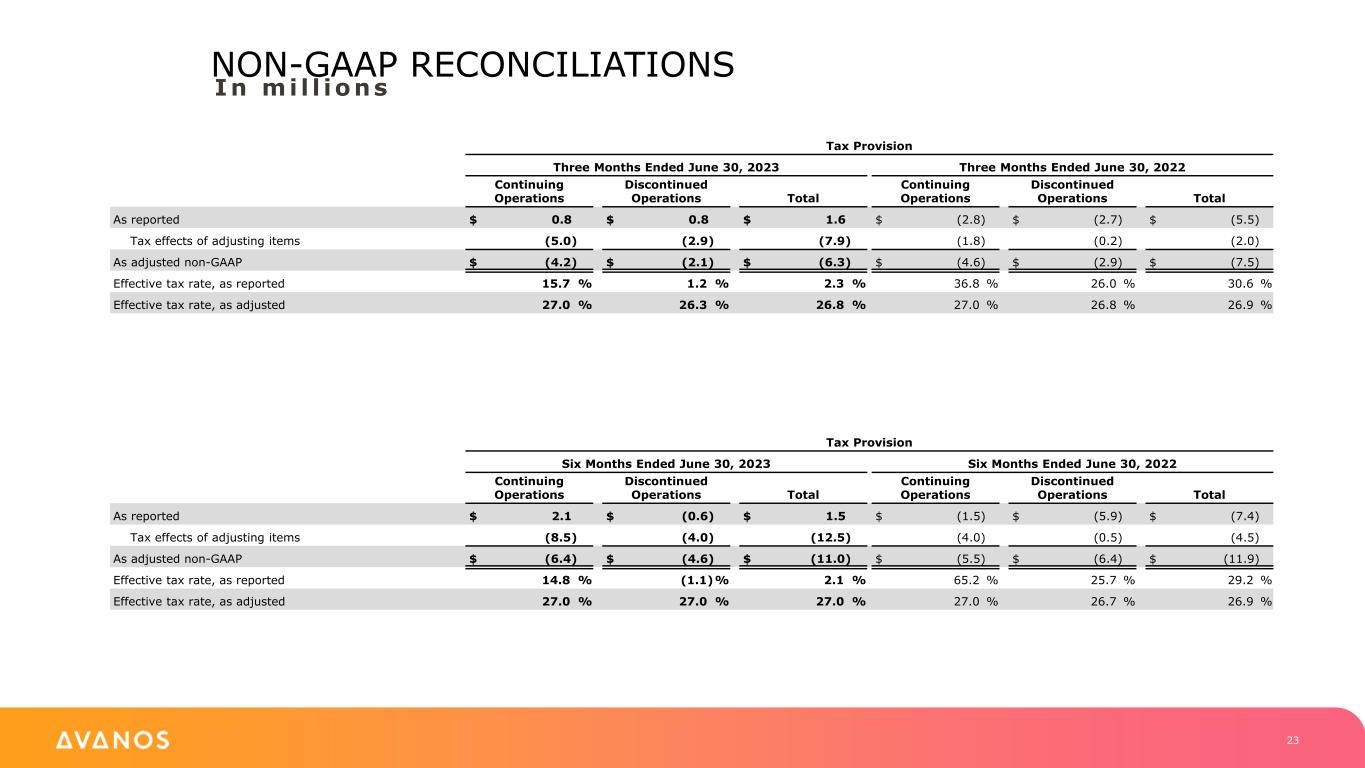 NON-GAAP RECONCILIATIONS In mi l l ions Tax Provision Six Months Ended June 30, 2023 Six Months Ended June 30, 2022 Continuing Operations Discontinued Operations Total Continuing Operations Discontinued Operations Total As reported $ 2.1 $ (0.6) $ 1.5 $ (1.5) $ (5.9) $ (7.4) Tax effects of adjusting items (8.5) (4.0) (12.5) (4.0) (0.5) (4.5) As adjusted non-GAAP $ (6.4) $ (4.6) $ (11.0) $ (5.5) $ (6.4) $ (11.9) Effective tax rate, as reported 14.8 % (1.1)% 2.1 % 65.2 % 25.7 % 29.2 % Effective tax rate, as adjusted 27.0 % 27.0 % 27.0 % 27.0 % 26.7 % 26.9 % Tax Provision Three Months Ended June 30, 2023 Three Months Ended June 30, 2022 Continuing Operations Discontinued Operations Total Continuing Operations Discontinued Operations Total As reported $ 0.8 $ 0.8 $ 1.6 $ (2.8) $ (2.7) $ (5.5) Tax effects of adjusting items (5.0) (2.9) (7.9) (1.8) (0.2) (2.0) As adjusted non-GAAP $ (4.2) $ (2.1) $ (6.3) $ (4.6) $ (2.9) $ (7.5) Effective tax rate, as reported 15.7 % 1.2 % 2.3 % 36.8 % 26.0 % 30.6 % Effective tax rate, as adjusted 27.0 % 26.3 % 26.8 % 27.0 % 26.8 % 26.9 % 23