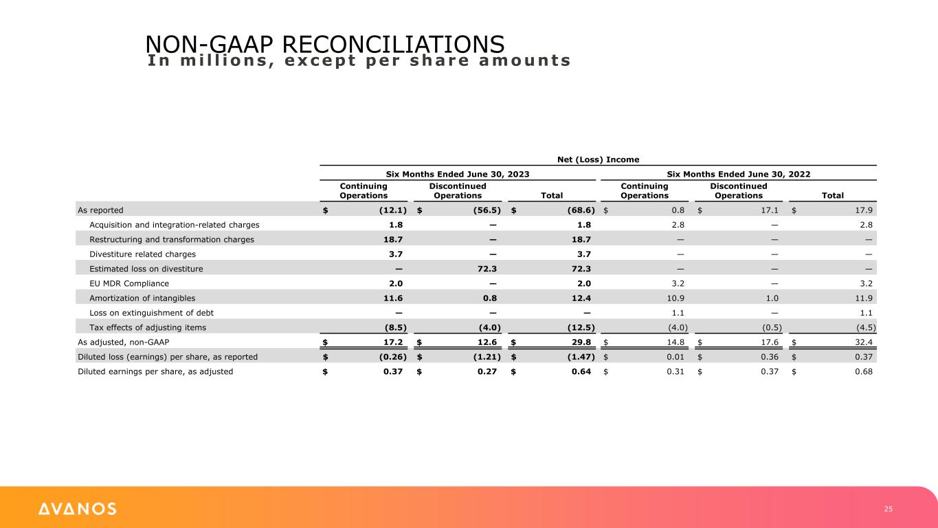 NON-GAAP RECONCILIATIONS In mi l l ions , except per share amounts Net (Loss) Income Three Months Ended June 30, 2023 Three Months Ended June 30, 2022 Continuing Operations Discontinued Operations Total Continuing Operations Discontinued Operations Total As reported $ (4.3) $ (63.8) $ (68.1) $ 4.8 $ 7.7 $ 12.5 Acquisition and integration-related charges 0.3 — 0.3 1.0 — 1.0 Restructuring and transformation charges 9.8 — 9.8 — — — Divestiture related charges 3.7 — 3.7 — — — Estimated loss on divestiture — 72.3 72.3 — — — EU MDR Compliance 0.9 — 0.9 1.7 — 1.7 Amortization of intangibles 5.8 0.3 6.1 5.7 0.5 6.2 Loss on extinguishment of debt — — — 1.1 — 1.1 Tax effects of adjusting items (5.0) (2.9) (7.9) (1.8) (0.2) (2.0) As adjusted, non-GAAP $ 11.2 $ 5.9 $ 17.1 $ 12.5 $ 8.0 $ 20.5 Diluted loss (earnings) per share, as reported $ (0.09) $ (1.37) $ (1.46) $ 0.10 $ 0.16 $ 0.26 Diluted earnings per share, as adjusted $ 0.24 $ 0.13 $ 0.37 $ 0.26 $ 0.17 $ 0.43 24