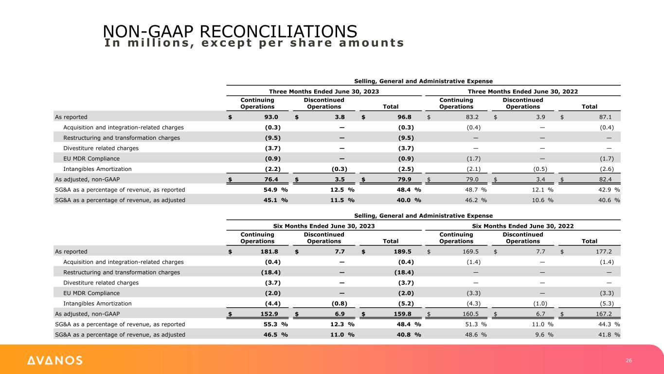 NON-GAAP RECONCILIATIONS In mi l l ions , except per share amounts Selling, General and Administrative Expense Three Months Ended June 30, 2023 Three Months Ended June 30, 2022 Continuing Operations Discontinued Operations Total Continuing Operations Discontinued Operations Total As reported $ 93.0 $ 3.8 $ 96.8 $ 83.2 $ 3.9 $ 87.1 Acquisition and integration-related charges (0.3) — (0.3) (0.4) — (0.4) Restructuring and transformation charges (9.5) — (9.5) — — — Divestiture related charges (3.7) — (3.7) — — — EU MDR Compliance (0.9) — (0.9) (1.7) — (1.7) Intangibles Amortization (2.2) (0.3) (2.5) (2.1) (0.5) (2.6) As adjusted, non-GAAP $ 76.4 $ 3.5 $ 79.9 $ 79.0 $ 3.4 $ 82.4 SG&A as a percentage of revenue, as reported 54.9 % 12.5 % 48.4 % 48.7 % 12.1 % 42.9 % SG&A as a percentage of revenue, as adjusted 45.1 % 11.5 % 40.0 % 46.2 % 10.6 % 40.6 % Selling, General and Administrative Expense Six Months Ended June 30, 2023 Six Months Ended June 30, 2022 Continuing Operations Discontinued Operations Total Continuing Operations Discontinued Operations Total As reported $ 181.8 $ 7.7 $ 189.5 $ 169.5 $ 7.7 $ 177.2 Acquisition and integration-related charges (0.4) — (0.4) (1.4) — (1.4) Restructuring and transformation charges (18.4) — (18.4) — — — Divestiture related charges (3.7) — (3.7) — — — EU MDR Compliance (2.0) — (2.0) (3.3) — (3.3) Intangibles Amortization (4.4) (0.8) (5.2) (4.3) (1.0) (5.3) As adjusted, non-GAAP $ 152.9 $ 6.9 $ 159.8 $ 160.5 $ 6.7 $ 167.2 SG&A as a percentage of revenue, as reported 55.3 % 12.3 % 48.4 % 51.3 % 11.0 % 44.3 % SG&A as a percentage of revenue, as adjusted 46.5 % 11.0 % 40.8 % 48.6 % 9.6 % 41.8 % 26