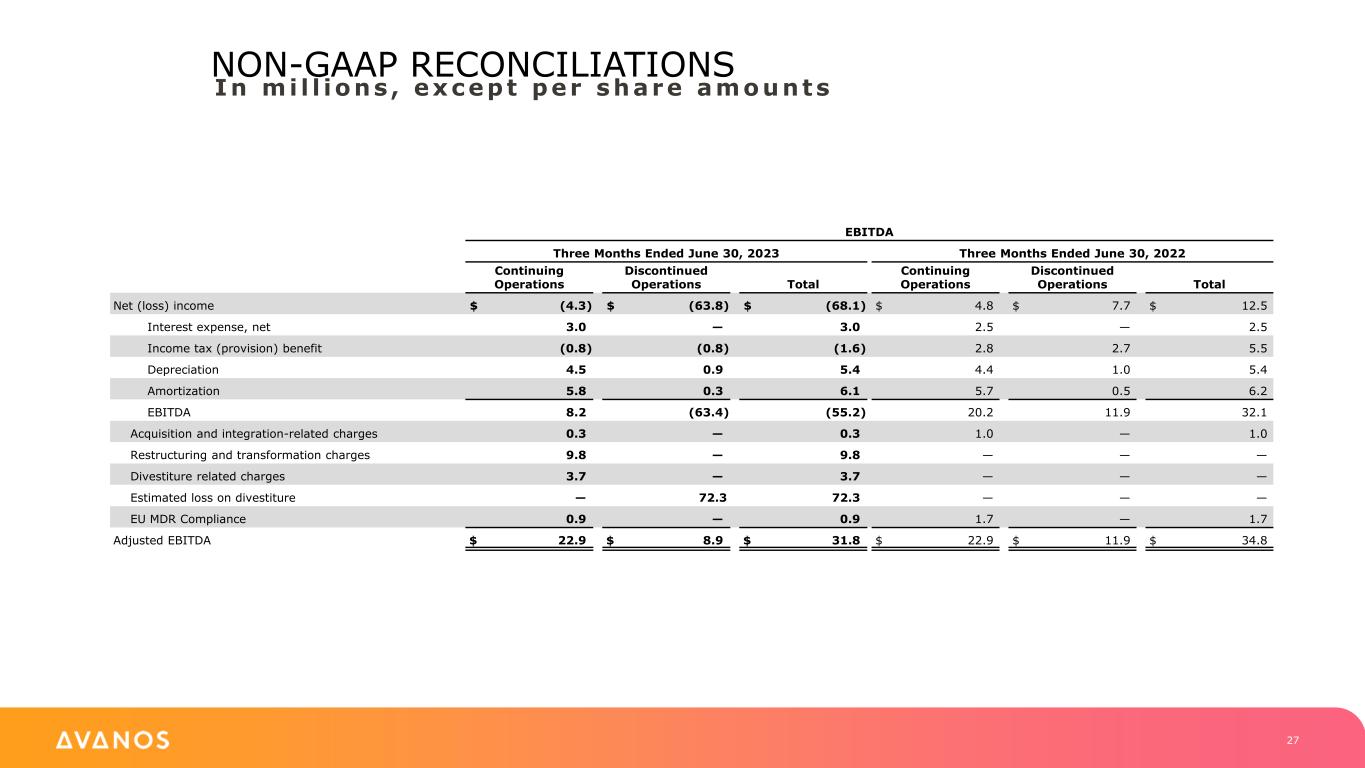 NON-GAAP RECONCILIATIONS In mi l l ions , except per share amounts EBITDA Six Months Ended June 30, 2023 Six Months Ended June 30, 2022 Continuing Operations Discontinued Operations Total Continuing Operations Discontinued Operations Total Net (loss) income $ (12.1) $ (56.5) $ (68.6) $ 0.8 $ 17.1 $ 17.9 Interest expense, net 6.0 — 6.0 3.8 — 3.8 Income tax (provision) benefit (2.1) 0.6 (1.5) 1.5 5.9 7.4 Depreciation 9.4 1.8 11.2 8.8 2.0 10.8 Amortization 11.6 0.8 12.4 10.9 1.0 11.9 EBITDA 12.8 (53.3) (40.5) 25.8 26.0 51.8 Acquisition and integration-related charges 1.8 — 1.8 2.8 — 2.8 Restructuring and transformation charges 18.7 — 18.7 — — — Divestiture related charges 3.7 — 3.7 — — — Estimated loss on divestiture — 72.3 72.3 — — — EU MDR Compliance 2.0 — 2.0 3.2 — 3.2 Adjusted EBITDA $ 39.0 $ 19.0 $ 58.0 $ 31.8 $ 26.0 $ 57.8 28