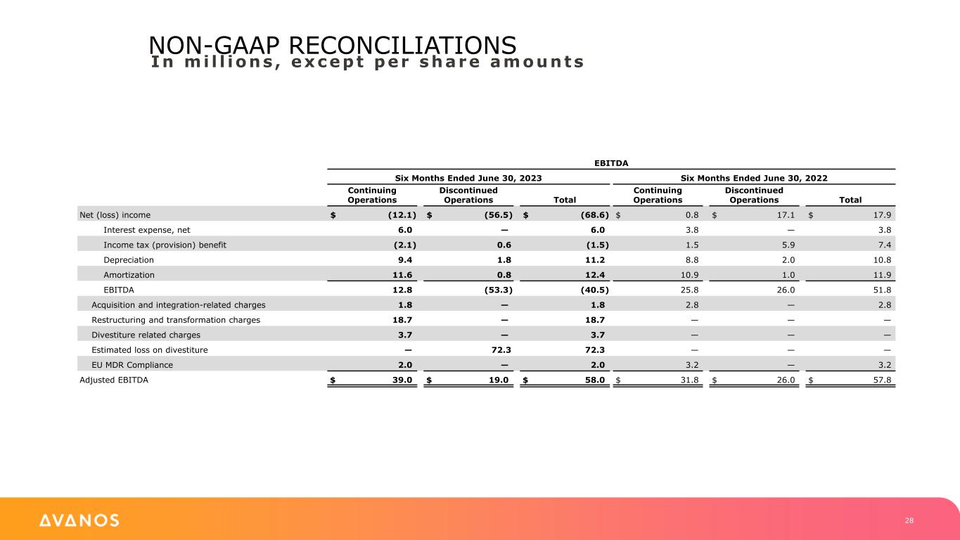 NON-GAAP RECONCILIATIONS In mi l l ions , except per share amounts EBITDA Three Months Ended June 30, 2023 Three Months Ended June 30, 2022 Continuing Operations Discontinued Operations Total Continuing Operations Discontinued Operations Total Net (loss) income $ (4.3) $ (63.8) $ (68.1) $ 4.8 $ 7.7 $ 12.5 Interest expense, net 3.0 — 3.0 2.5 — 2.5 Income tax (provision) benefit (0.8) (0.8) (1.6) 2.8 2.7 5.5 Depreciation 4.5 0.9 5.4 4.4 1.0 5.4 Amortization 5.8 0.3 6.1 5.7 0.5 6.2 EBITDA 8.2 (63.4) (55.2) 20.2 11.9 32.1 Acquisition and integration-related charges 0.3 — 0.3 1.0 — 1.0 Restructuring and transformation charges 9.8 — 9.8 — — — Divestiture related charges 3.7 — 3.7 — — — Estimated loss on divestiture — 72.3 72.3 — — — EU MDR Compliance 0.9 — 0.9 1.7 — 1.7 Adjusted EBITDA $ 22.9 $ 8.9 $ 31.8 $ 22.9 $ 11.9 $ 34.8 27