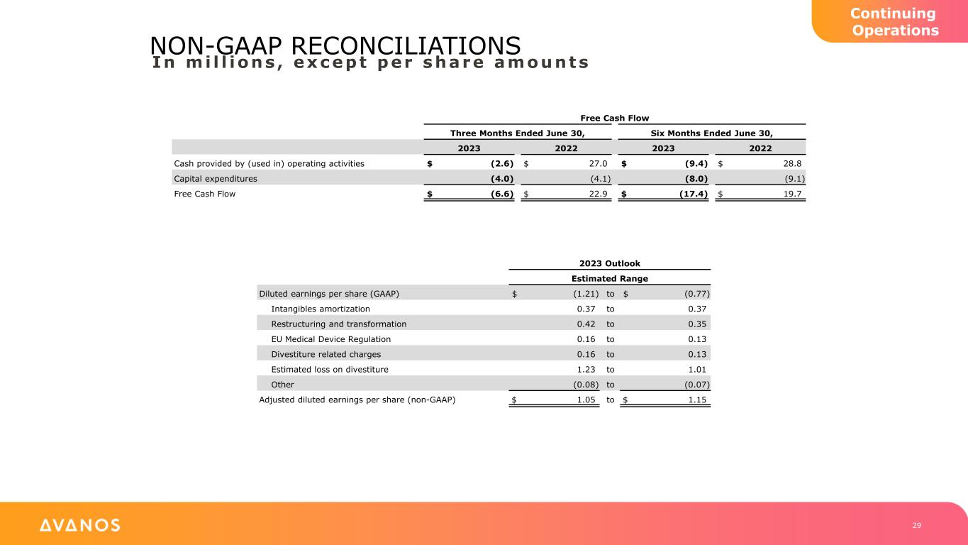 NON-GAAP RECONCILIATIONS In mi l l ions , except per share amounts Free Cash Flow Three Months Ended June 30, Six Months Ended June 30, 2023 2022 2023 2022 Cash provided by (used in) operating activities $ (2.6) $ 27.0 $ (9.4) $ 28.8 Capital expenditures (4.0) (4.1) (8.0) (9.1) Free Cash Flow $ (6.6) $ 22.9 $ (17.4) $ 19.7 2023 Outlook Estimated Range Diluted earnings per share (GAAP) $ (1.21) to $ (0.77) Intangibles amortization 0.37 to 0.37 Restructuring and transformation 0.42 to 0.35 EU Medical Device Regulation 0.16 to 0.13 Divestiture related charges 0.16 to 0.13 Estimated loss on divestiture 1.23 to 1.01 Other (0.08) to (0.07) Adjusted diluted earnings per share (non-GAAP) $ 1.05 to $ 1.15 Continuing Operations 29