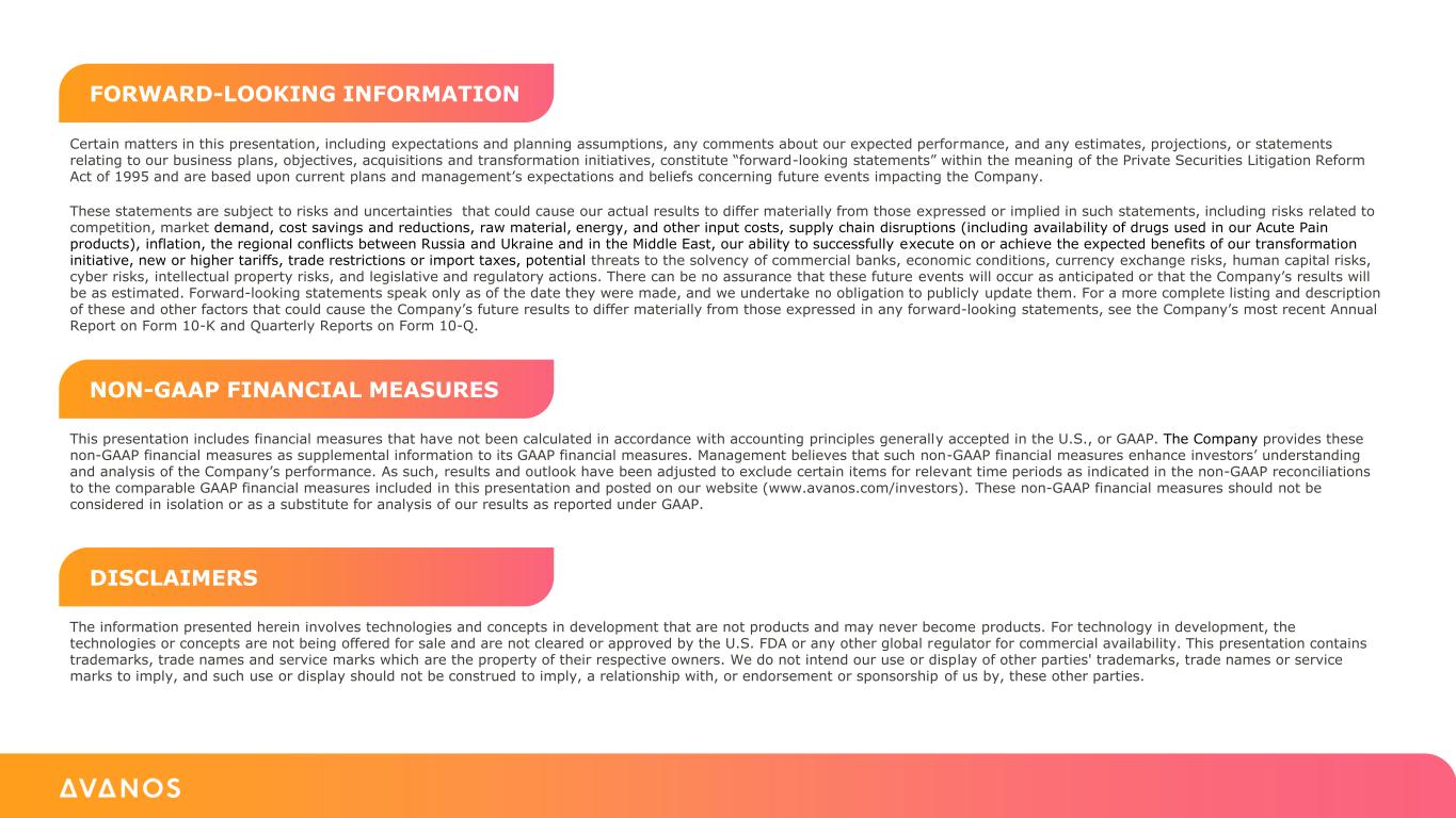 Certain matters in this presentation, including expectations and planning assumptions, any comments about our expected performance, and any estimates, projections, or statements relating to our business plans, objectives, acquisitions and transformation initiatives, constitute “forward-looking statements” within the meaning of the Private Securities Litigation Reform Act of 1995 and are based upon current plans and management’s expectations and beliefs concerning future events impacting the Company. These statements are subject to risks and uncertainties that could cause our actual results to differ materially from those expressed or implied in such statements, including risks related to competition, market demand, cost savings and reductions, raw material, energy, and other input costs, supply chain disruptions (including availability of drugs used in our Acute Pain products), inflation, the regional conflicts between Russia and Ukraine and in the Middle East, our ability to successfully execute on or achieve the expected benefits of our transformation initiative, new or higher tariffs, trade restrictions or import taxes, potential threats to the solvency of commercial banks, economic conditions, currency exchange risks, human capital risks, cyber risks, intellectual property risks, and legislative and regulatory actions. There can be no assurance that these future events will occur as anticipated or that the Company’s results will be as estimated. Forward-looking statements speak only as of the date they were made, and we undertake no obligation to publicly update them. For a more complete listing and description of these and other factors that could cause the Company’s future results to differ materially from those expressed in any forward-looking statements, see the Company’s most recent Annual Report on Form 10-K and Quarterly Reports on Form 10-Q. This presentation includes financial measures that have not been calculated in accordance with accounting principles generally accepted in the U.S., or GAAP. The Company provides these non-GAAP financial measures as supplemental information to its GAAP financial measures. Management believes that such non-GAAP financial measures enhance investors’ understanding and analysis of the Company’s performance. As such, results and outlook have been adjusted to exclude certain items for relevant time periods as indicated in the non-GAAP reconciliations to the comparable GAAP financial measures included in this presentation and posted on our website (www.avanos.com/investors). These non-GAAP financial measures should not be considered in isolation or as a substitute for analysis of our results as reported under GAAP. FORWARD-LOOKING INFORMATION NON-GAAP FINANCIAL MEASURES DISCLAIMERS The information presented herein involves technologies and concepts in development that are not products and may never become products. For technology in development, the technologies or concepts are not being offered for sale and are not cleared or approved by the U.S. FDA or any other global regulator for commercial availability. This presentation contains trademarks, trade names and service marks which are the property of their respective owners. We do not intend our use or display of other parties' trademarks, trade names or service marks to imply, and such use or display should not be construed to imply, a relationship with, or endorsement or sponsorship of us by, these other parties.