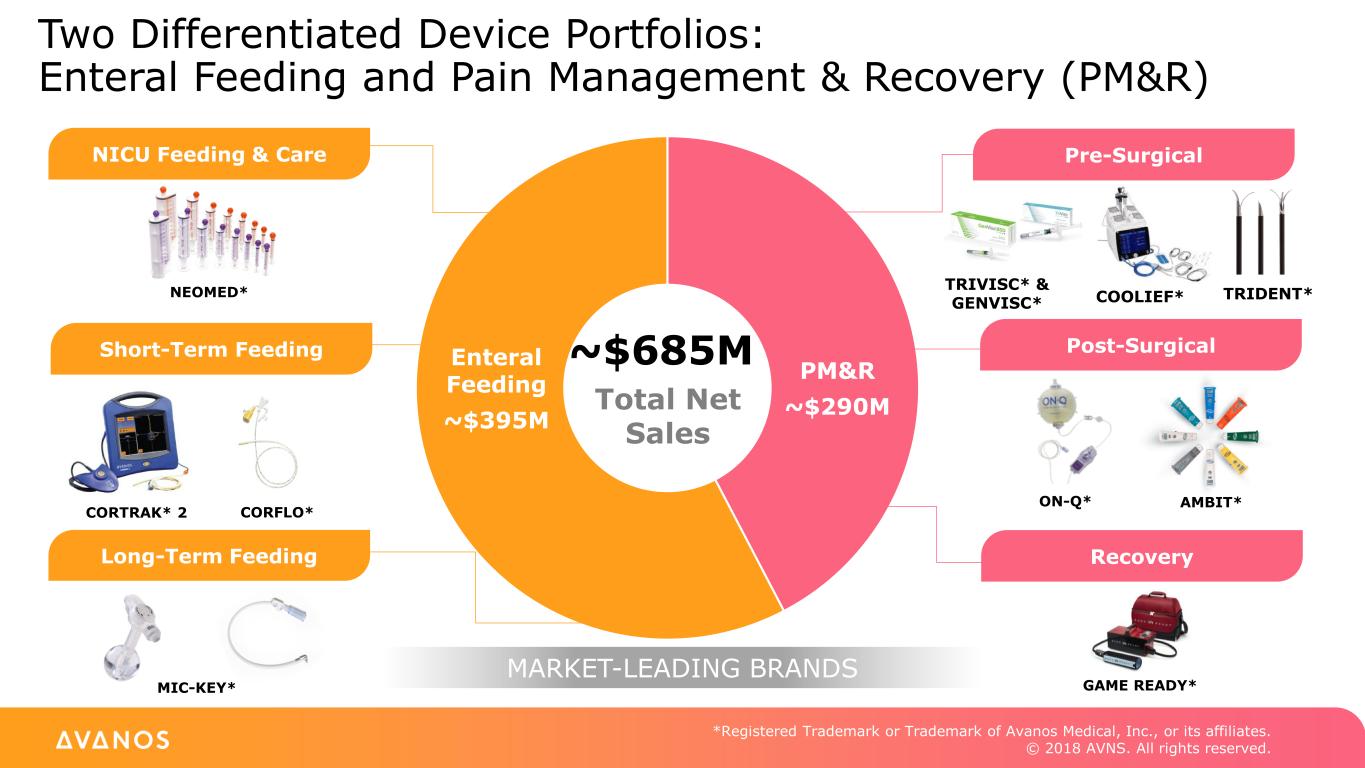 TRIDENT*COOLIEF* TRIVISC* & GENVISC* Enteral Feeding ~$395M PM&R ~$290M Two Differentiated Device Portfolios: Enteral Feeding and Pain Management & Recovery (PM&R) Short-Term Feeding CORTRAK* 2 NEOMED* Pre-Surgical ON-Q* AMBIT* Post-Surgical GAME READY* Recovery MIC-KEY* Long-Term Feeding MARKET-LEADING BRANDS ~$685M Total Net Sales NICU Feeding & Care CORFLO* *Registered Trademark or Trademark of Avanos Medical, Inc., or its affiliates. © 2018 AVNS. All rights reserved.